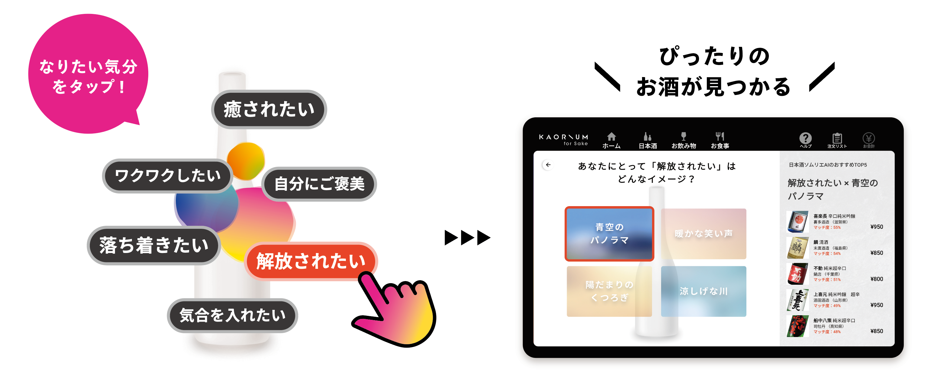 種類の多い日本酒はどれを選んでいいかわからないもの。KAORIUM for Sake は、「解放されたい」「ワクワクしたい」といった気分や、「個性的」「フルーティ」といった好みの味わいに合わせて、イメージに近い言葉を選んでいくと、AI が言葉と日本酒のマッチ度を解析しぴったりのお酒をレコメンドしてくれます。これにより、直感的に今欲しいお酒を選ぶことができるようになります。