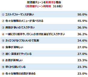 一方、利用する理由は「コスパが良い」「色々食べられる」「席数が多い」「相手を選ばず入りやすい」「食事が美味しい」等が上位にあがり、足が遠のいている人との認識にギャップが見られる。