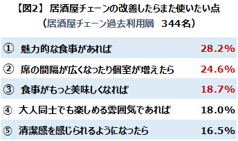 2.過去利用層が改善を希望するポイントは、「魅力的な食事」が1位。今の居酒屋チェーン現場では食事へのこだわりも。