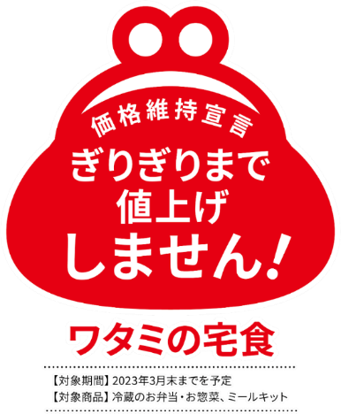 「ワタミの宅食」では、2023年3月末までは現行の商品価格を維持し、値上げせず提供することを決めました。対象は、冷蔵のお弁当・お惣菜6種類、健康習慣シリーズおよびミールキット(「あっ!と ごはん」「PAKU MOGU」となります。食材・エネルギー等の原料価格の高騰そして急激な円安が続いており、当社においても他社と同様、大きく影響を受けております。お客さまの家計への負担を増やさず、日々の食生活を少しでもサポートしたいという思いから、ぎりぎりまで値上げしない方針です。仕入れ・購買方法の見直し、製造工程の改善など自社で可能な限りのコスト削減や合理化を図り、品質を保ちながら価格維持に努めます。