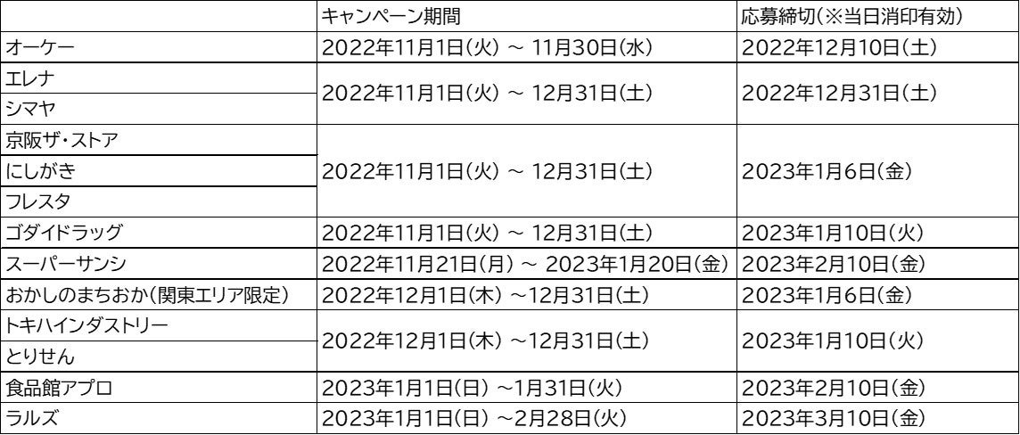 一部のスーパーマーケット等で実施となり、キャンペーン期間は企業により異なります。