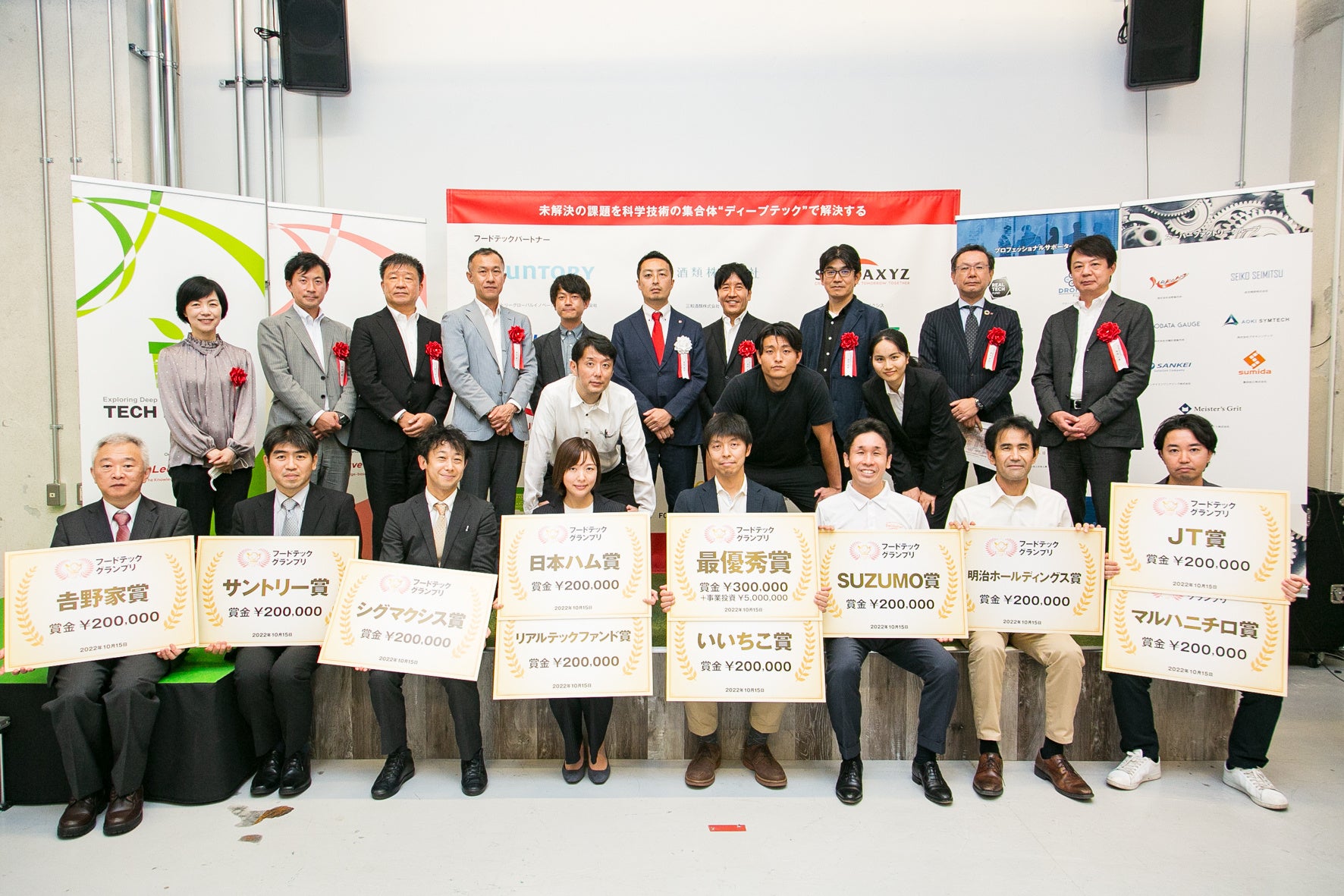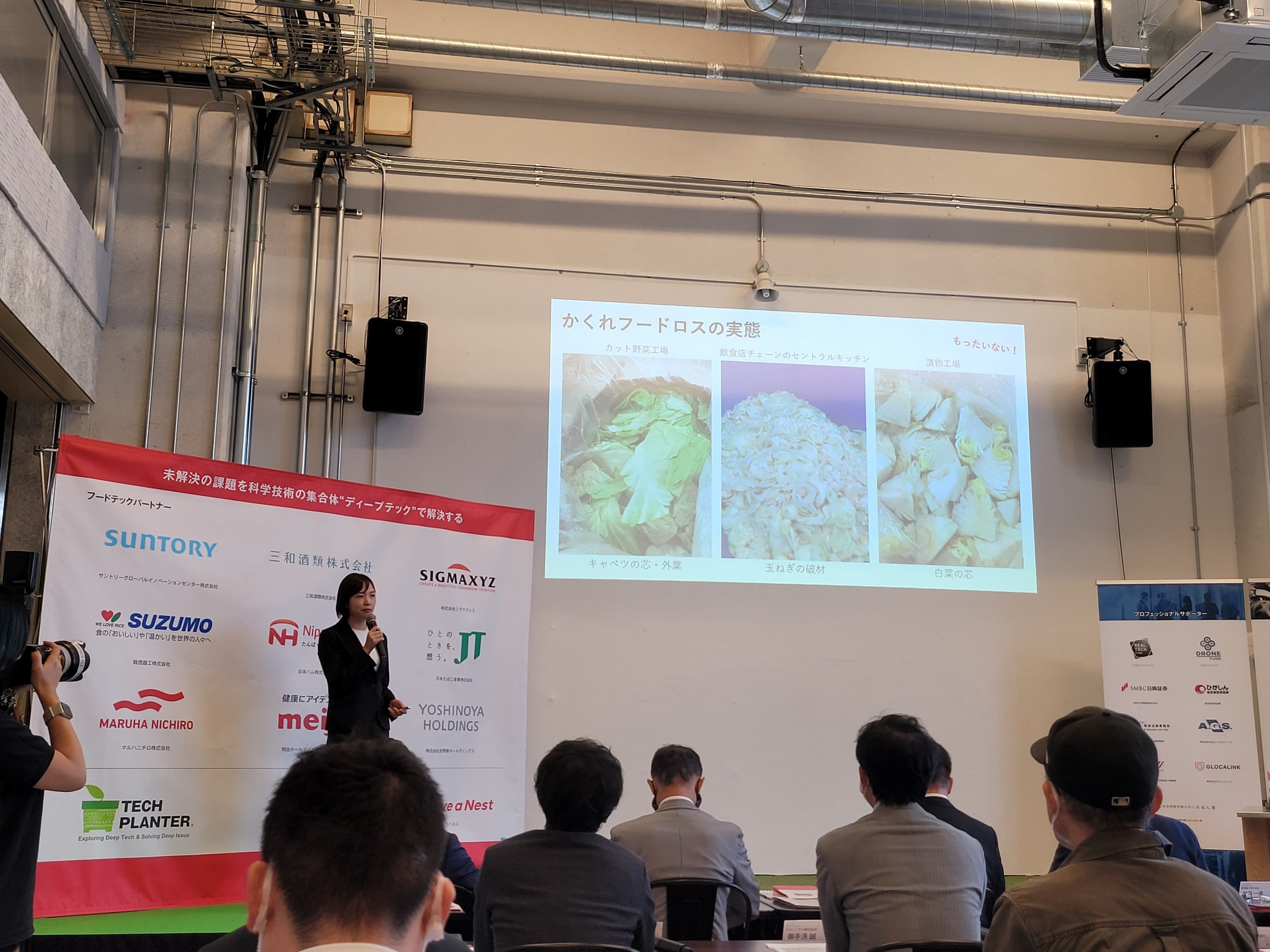 「フードテックグランプリ」は、テックプランターの中の7つ部門(ディープテック、アグリテック、バイオテック、マリーンテック、メドテック、フードテック)のうちのひとつで、事業会社トップへのプレゼンを行うデモデーにあたります。「フードテックグランプリ2022」はリアルテック領域(持続可能な食産業を実現しうる食品生産・加工技術・流通システム等)の技術シーズと起業家の発掘育成を目的としたプログラムで、「持続可能な食産業の実現」をテーマとしたアイデアが集まりました。
