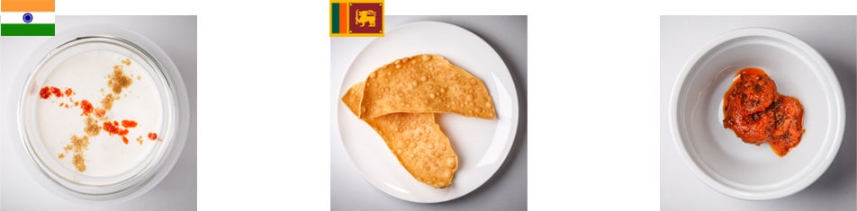 島国スリランカらしい魚を使ったカレー、ココナッツミルクのクリーミーさにコラカ(酸味料)を加えた独特の味わい。ナスのモージュ(和え物)・デビルドポテト(じゃがいものドライカレー)・シーニサンボール(タマネギの和え物)・ポルサンボール(ココナッツのふりかけ)パリップ(豆カレー)・パパダン(豆のせんべい)をお皿の手前で少しずつ混ぜて楽しんでください!