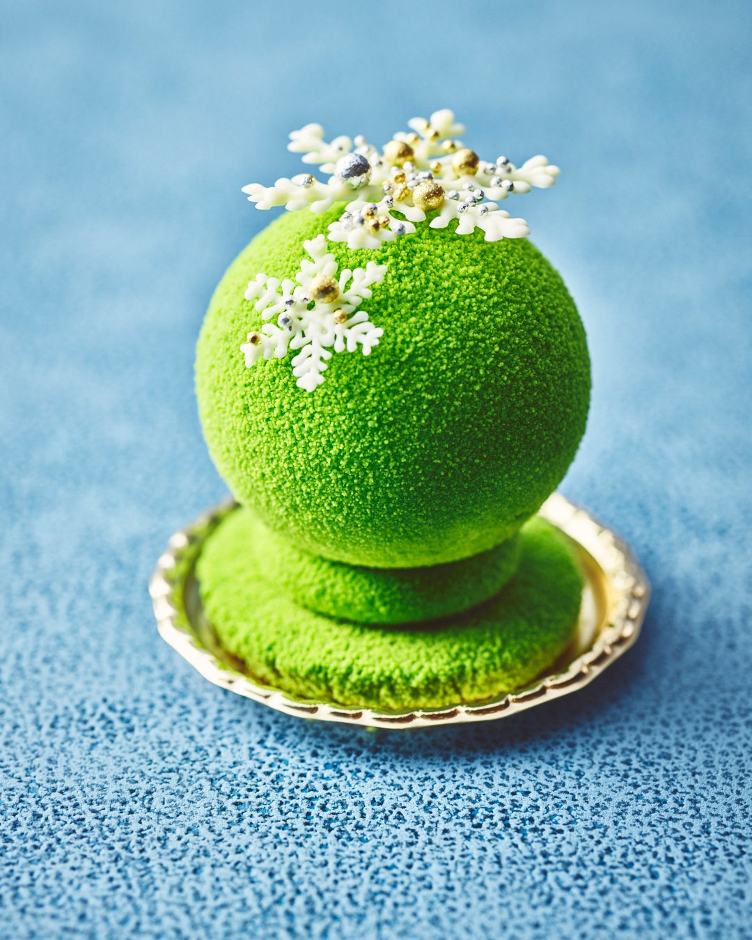 クリスマスオーナメントのような“スフェール(球体)”の形をした、グリーンの見た目がキュートなムース。外側の抹茶ムースにはホワイトチョコレートをあわせ、内側にはコク深いココナッツムースに洋梨のコンポートやベリーのジュレなどを忍ばせました。様々なフレーバーを楽しみながら、秀逸なペアリングをご堪能ください。