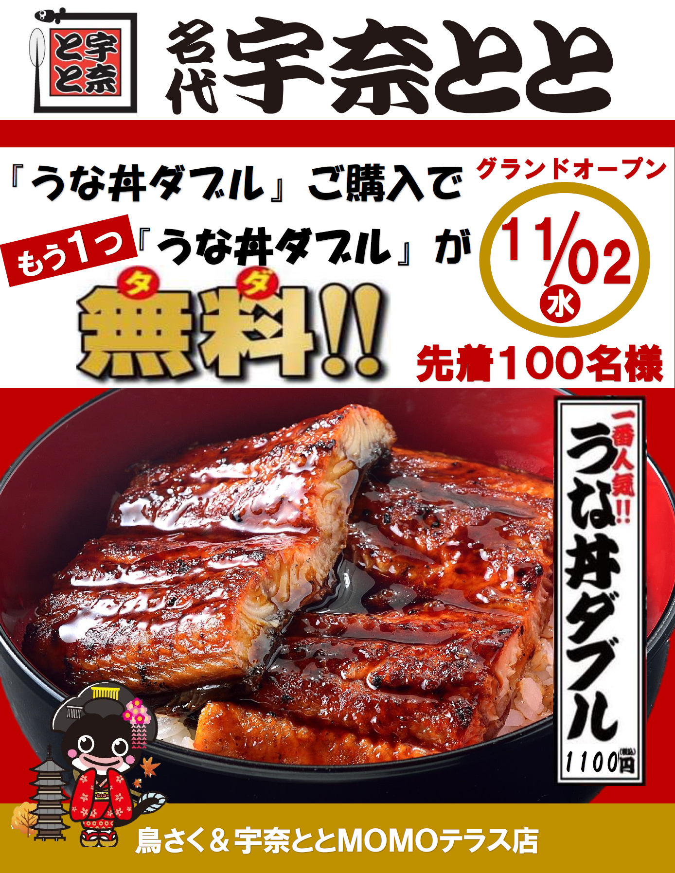 皆様から愛されるお店を目指しまして、グランドOPEN当日の11月2日にOPEN記念キャンペーンを実施いたします!不動の人気No.1メニュー「うな丼ダブル」を一つ購入すると、もう一つ無料となります。対象は先着100名様で、店内でご飲食、または二つともテイクアウトのどちらかをご選択いただきます。一つ分の料金で二つの商品を購入できる、大変お得なキャンペーンですので、ぜひご利用ください!