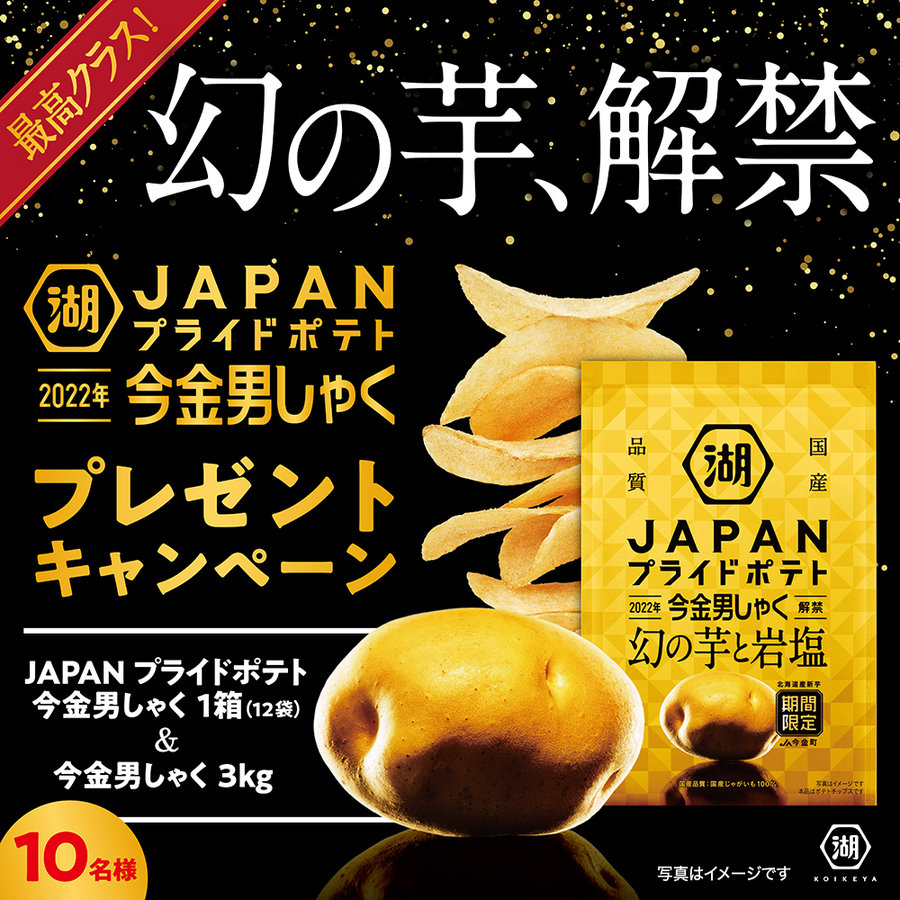 幻の芋と呼ばれる “今金男しゃく” と、ポテトチップスを60年もの間作り続けてきた湖池屋の“老舗のプライド”を掛け合わせることで誕生した「JAPANプライドポテト 今金男しゃく 幻の芋と岩塩」の発売にあたり、北海道の広大な大地で育まれた「今金男しゃく」の素材の素晴らしさとともに「JAPANプライドポテト 今金男しゃく」を味わっていただきたいとの思いから、「今金男しゃく」(1箱/3kg) と「JAPANプライドポテト 今金男しゃく 幻の芋と岩塩」(1箱/12袋) をセットにして、抽選で10名様にプレゼントするプレゼントキャンペーンを実施します。