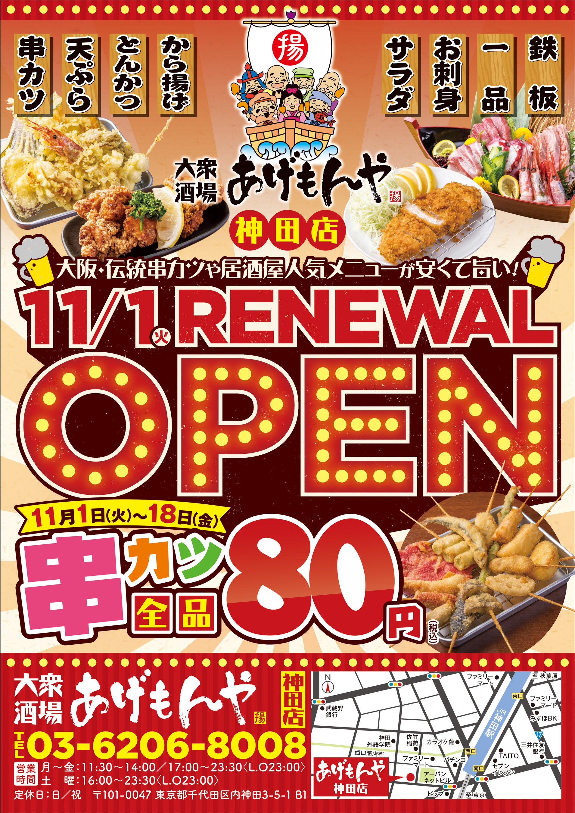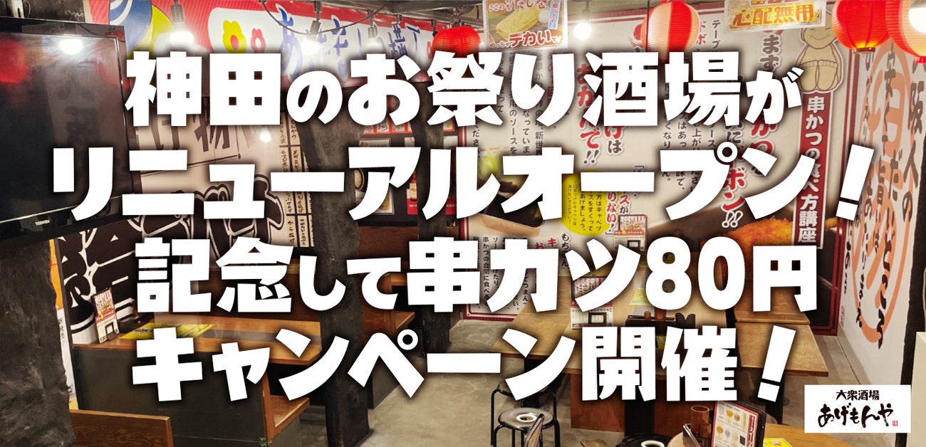 大阪の伝統串カツが自慢の「大衆酒場あげもんや 神田店」(住所:東京都千代田区内神田3-5-1 大蓄ビルB1、TEL:03-6206 8008)が11/1リニューアルオープン!記念して11月1日(火)〜18日(金)に限り「串カツ全品」を期間限定80円(税込)でご提供いたします。