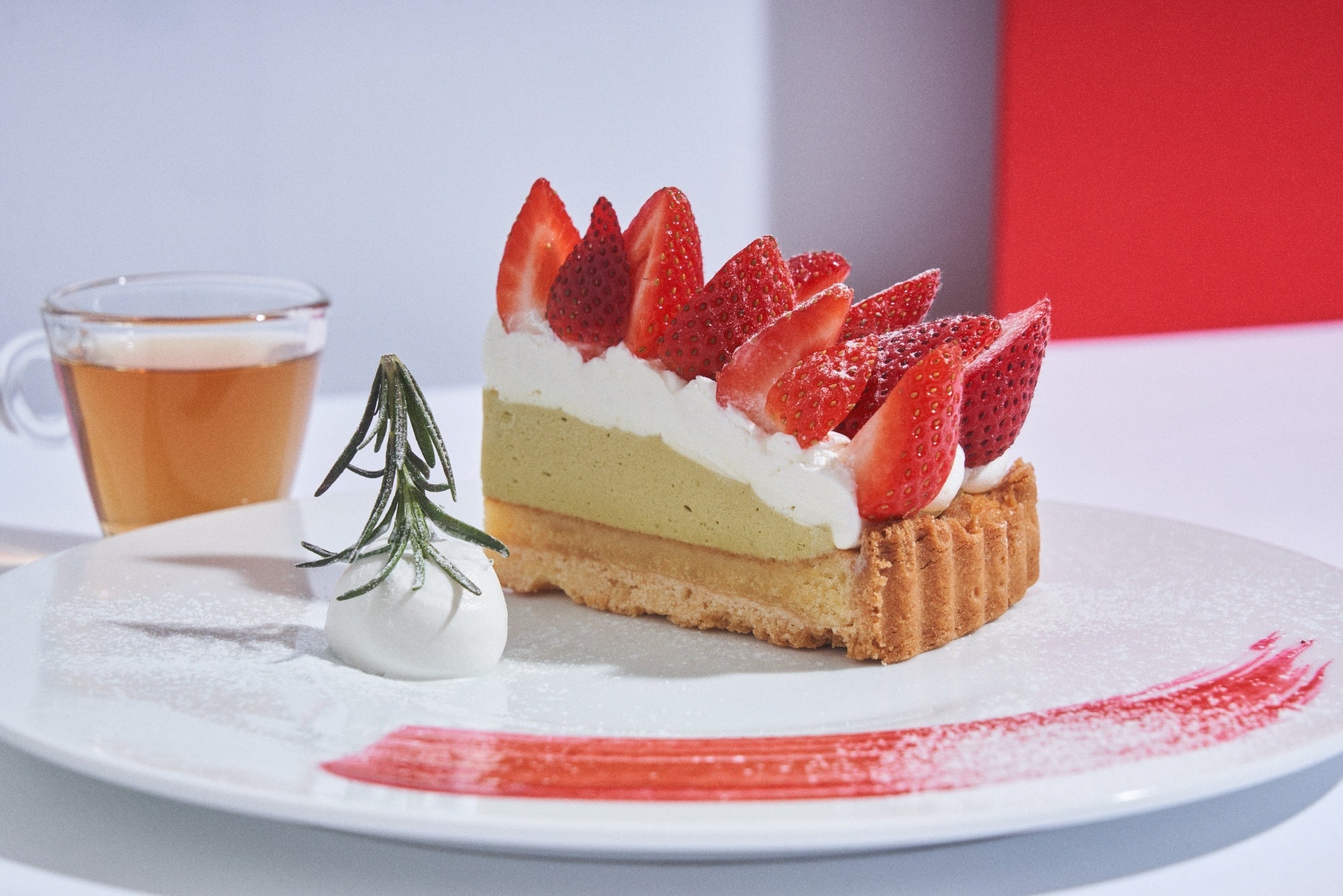 豊かな味と香り、まろやかな風味を感じる濃厚リッチなピスタチオクリームに、さっぱりと仕上げたフロマージュブランのムース、フレッシュいちごを合わせました。甘酸っぱいいちごソースをたっぷりとかけて。