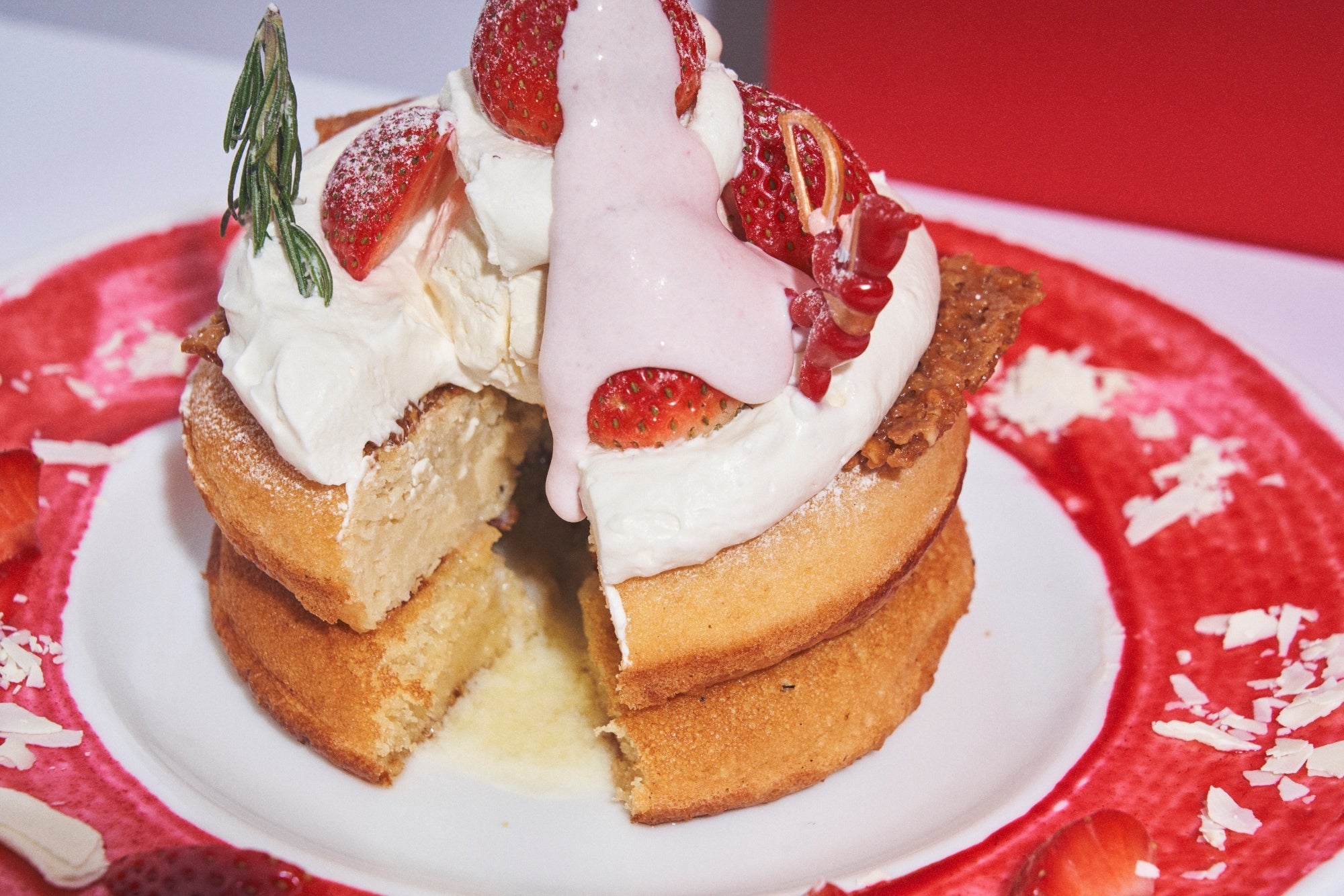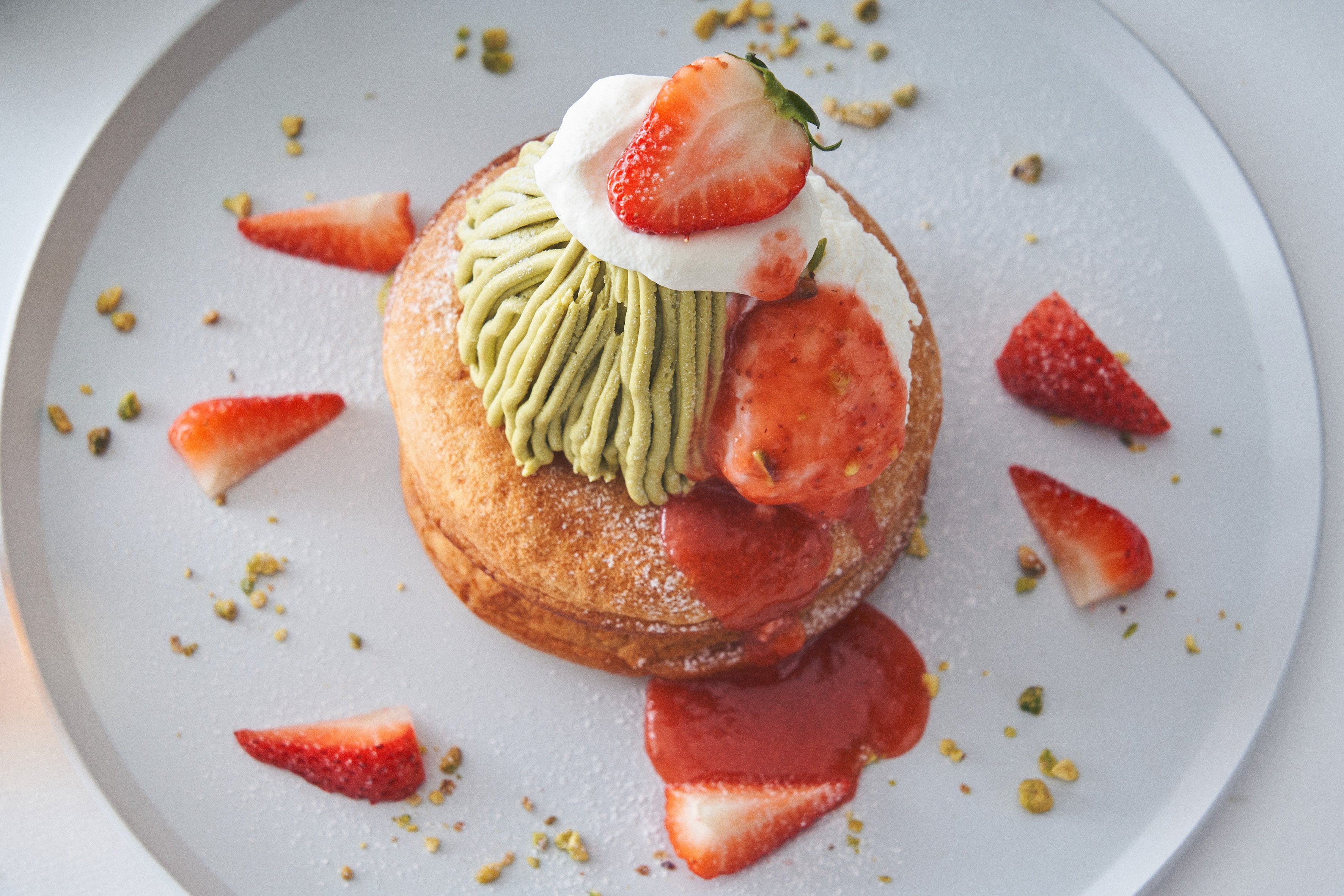 - クリスマス感たっぷり!いちご×濃厚ピスタチオクリームの限定パンケーキが登場。