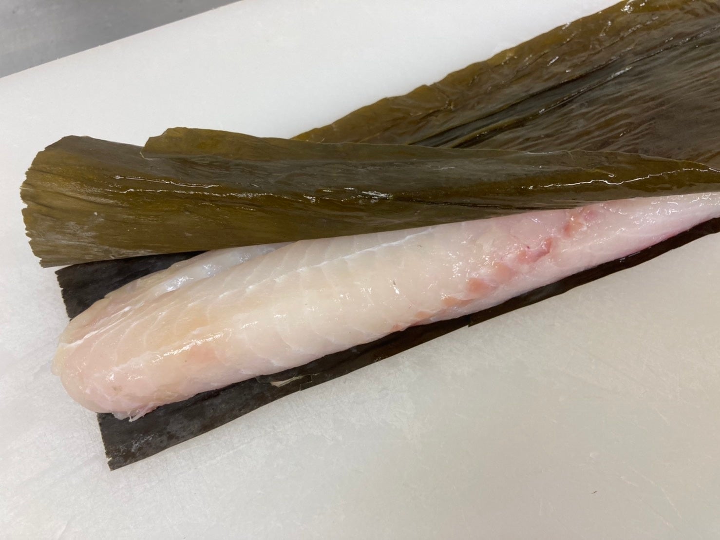 真だらは昆布との相性がとても良いため、今回は昆布〆にして提供いたします。真だらは白身魚の中でも一際水分が多いため、水っぽくならないように真だらの余分な水分を抜いてから、昆布に挟んで熟成させました。