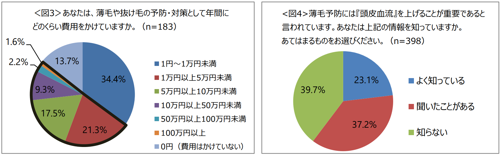 進行した薄毛には薬による治療が必要となります。そうなる前に可能な薄毛対策としては、シャンプーや育毛剤による頭皮環境のケア、頭皮マッサージなどが挙げられます。コストが発生しない対策である頭皮マッサージには、リラックス効果に加えて、血行を良くし、頭皮血流を上げる効果があります。薄毛の初期段階では頭皮血流が低下している事が報告されています。頭皮血流の改善は、毛髪の健やかな成長に繋がるとともに薄毛予防の一つとなる可能性があります。しかし、薄毛と頭皮血流の関連性について知っている人が、たったの23.1%と認知は十分に広がっておりません<図4>。頭皮血流の低下は、薄毛・抜け毛だけでなく、肩こりや疲れ目等の様々な悪影響をもたらす可能性もあります。日常の対策として頭皮マッサージ等、頭皮血流を上げる対策を継続して行うことが重要です。
