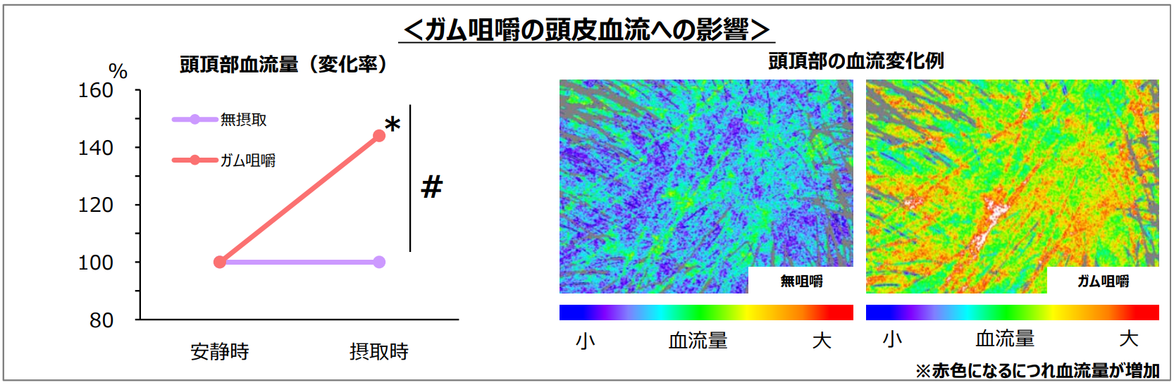 無摂取時と比較し、ガム咀嚼時の頭頂部および前頭部の頭皮血流が有意に増加する結果を示しました。