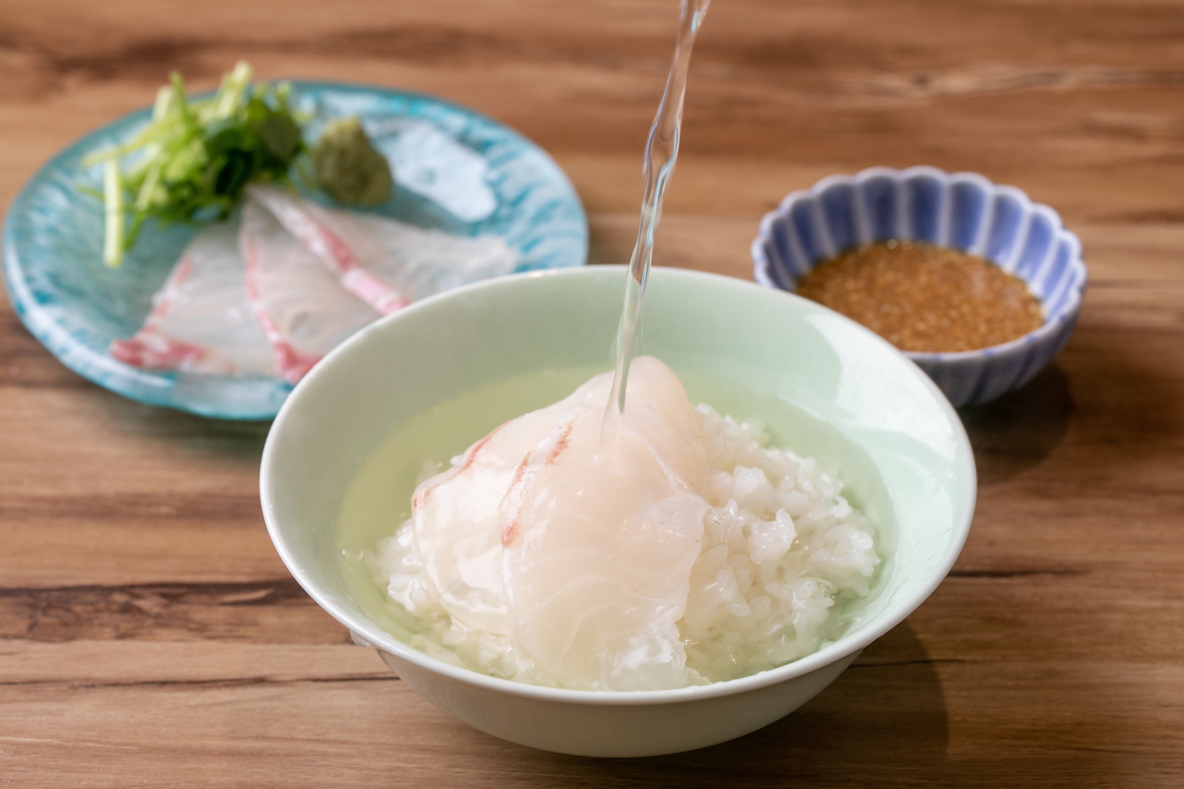 真鯛の薄造りをごまだれに絡め、ごはんにのせてお召し上がりいただきます。鯛出汁をかけてお楽しみください。