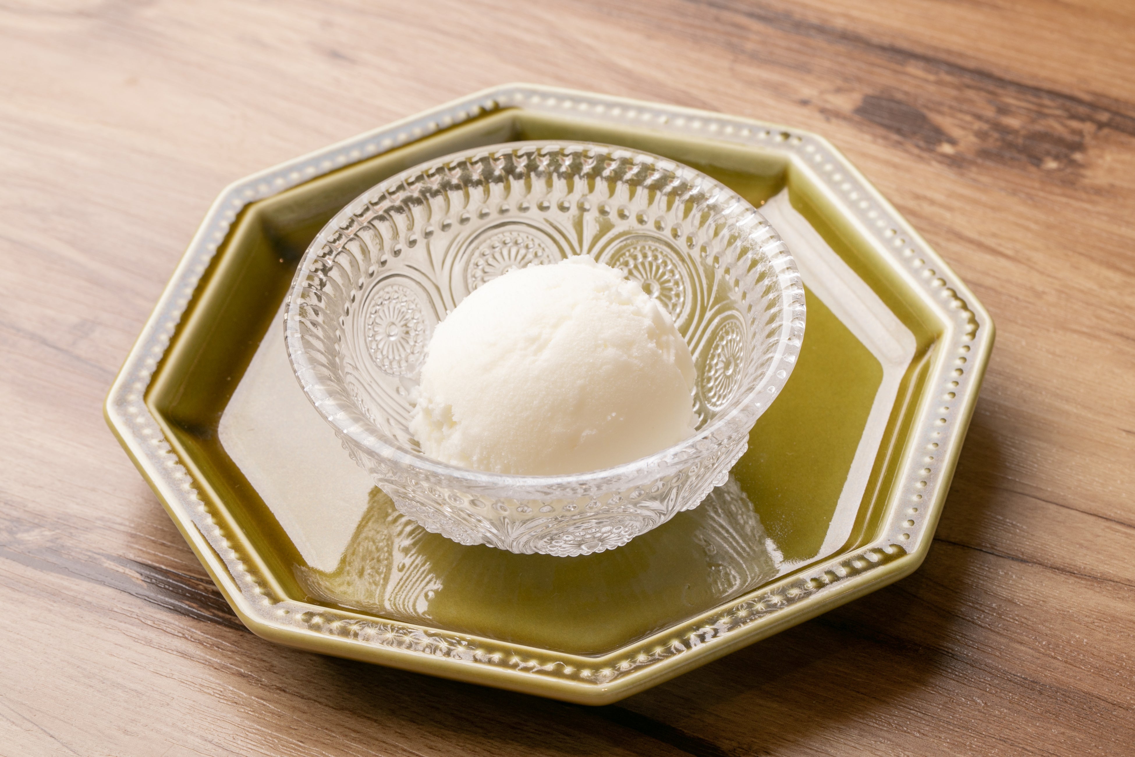 デザートのお米アイスは、柔らかく炊いたごはん凍らせ優しい甘さで後味がさっぱりとした、みるくアイスに混ぜ込んでいます。お米の粒つぶ食感をお楽しみください