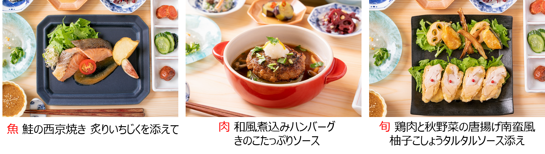 この秋メニューの主菜コンセプトは「ごはんに合うコク深い味わい 秋野菜で彩りを」です。西京味噌の旨味やしょうゆの甘辛さ、クリーミーなタルタルソースなどでコク深い味わいを表現しております。旬の食材をふんだんに使用しておりますので、心や体に優しい和食に仕立てています。