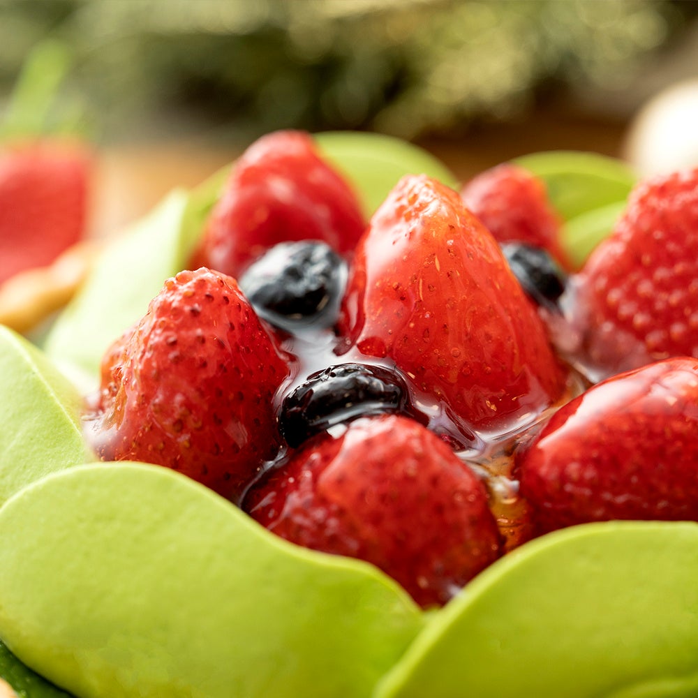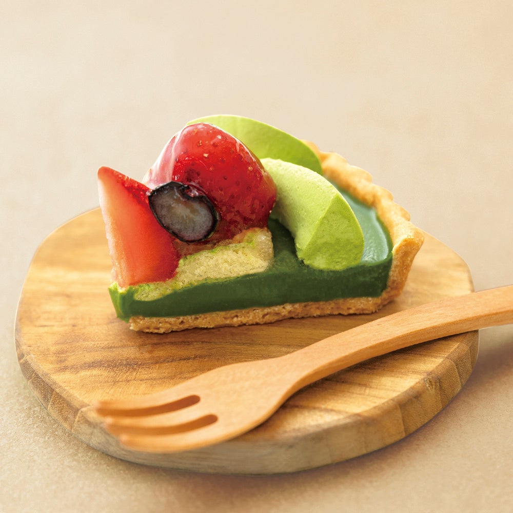 香ばしいタルト生地の上に重なる「抹茶ガナッシュ」は、宇治抹茶にホワイトチョコレートとクリームを組み合わせ、まるで生チョコのようにとろ〜りとしたリッチな口あたりと、さっぱりとしたバランスの両方を実現しました。アクセントとなる、ほどよい酸味のあるいちごとベリーの爽やかさに、ふわふわっと包み込むこだわりの「抹茶クリーム」を一緒に召し上がっていただくことで、いままでにない新食感をご提供いたします。