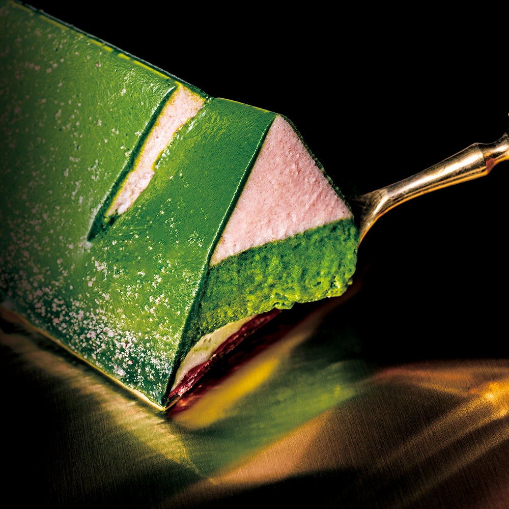 プレミアムという名のとおり、サクサクとした食感の「いちごショコラ・フィユティーヌ」の上に、濃厚な味わいを包み込むような優しい甘さの「ミルクガナッシュ」を添え、さらに口溶けなめらかな「抹茶」と「いちご」のショコラムースを一層づつ重ねた、贅沢なハーモニーがポイント。また、仕上げには、上品で大人なほろ苦さを添える「抹茶ショコラ・グラサージュ」でコーティングし、クリスマスらしいピンクのいちごパウダーで、見た目も華やかに彩ります。