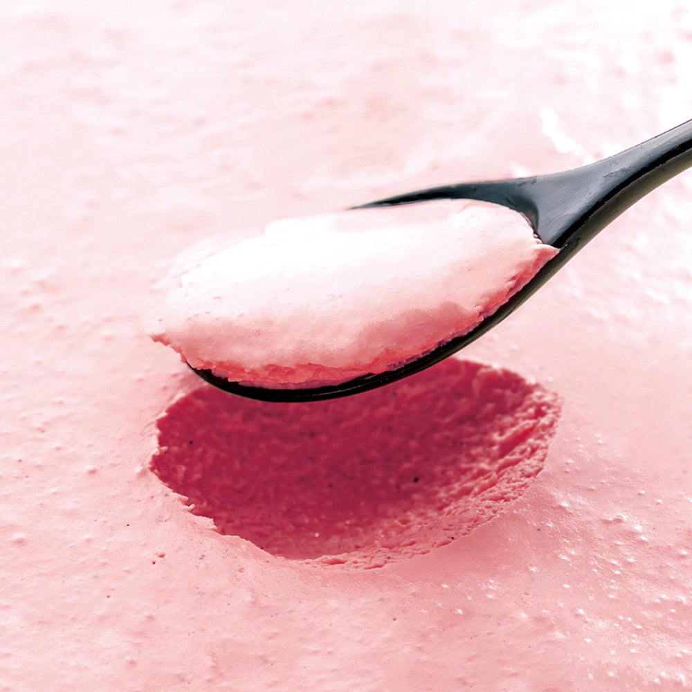 いちごの優しい甘みと酸味が引き立つように仕上げたムースは、香りや甘さを整え、抹茶と調和する味わいに。