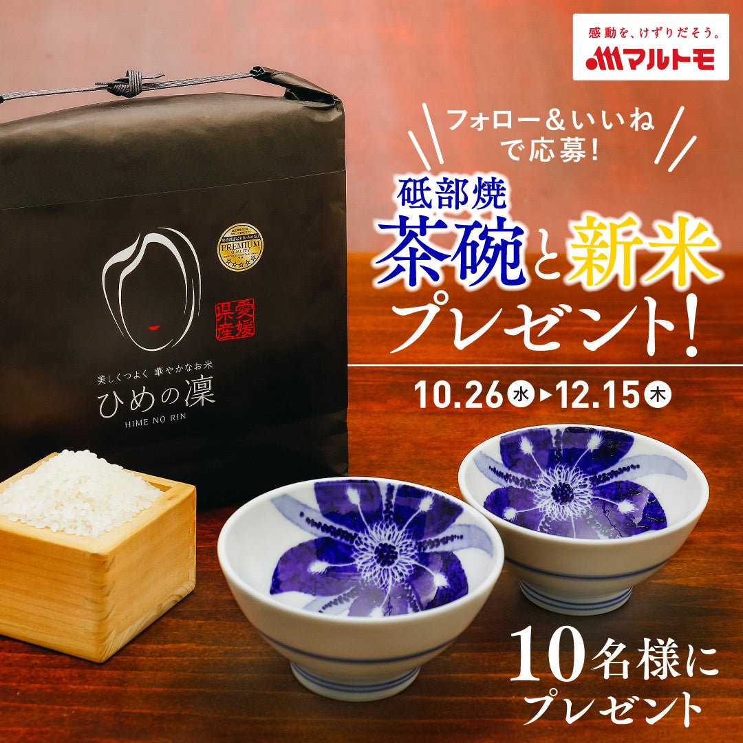 かつお節・だしと、海洋資源を通じて健康と食文化の発展に貢献するマルトモ株式会社(社長:今井均 本社:愛媛県伊予市)は、マルトモInstagram公式アカウントをフォローしていただいた方に、抽選で地元愛媛のブランド米「ひめの凛」の新米と、愛媛の砥部焼「きよし窯」の夫婦茶碗が10名様に当たるキャンペーンを実施中です。