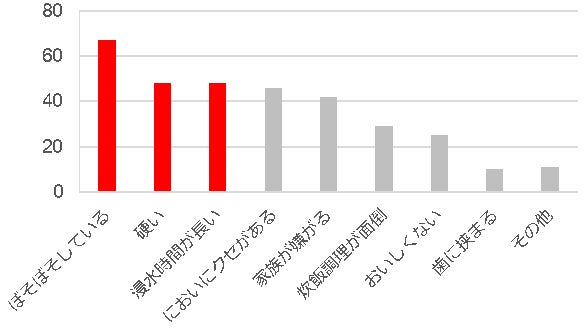 既存の玄米・加工玄米の不満点について221人の消費者にアンケートを行ったところ、第一位は「ぼそぼそしている」、第二位は「硬い」、第三位は「浸水時間が長い」でした。(はくばく調べ)