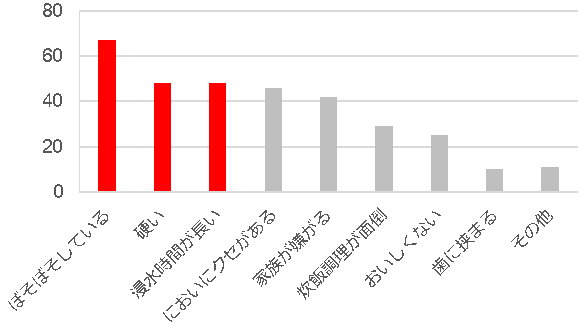 既存の玄米・加工玄米の不満点について221人の消費者にアンケートを行ったところ、第一位は「ぼそぼそしている」、第二位は「硬い」、第三位は「浸水時間が長い」でした。(はくばく調べ)