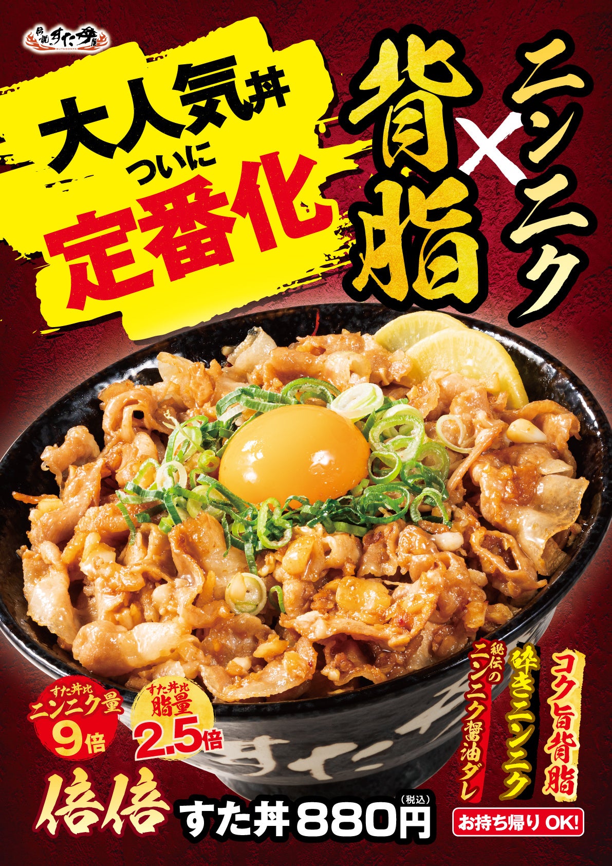 累計40万食を売り上げている人気メニューですた丼比ニンニク約9倍・脂量約2.5倍の“超すたみな丼”、「倍倍すた丼」をグランドメニュー化いたしました。