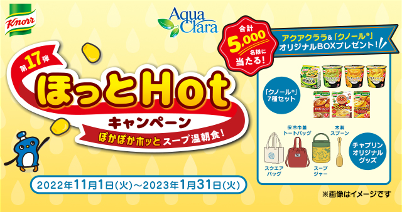 水を通じて“生活”“環境”“健康”の創造を目指すアクアクララ株式会社(本社:東京都港区、代表取締役社長:赤津裕次郎)は、全国のアクアクララ会員を対象としたクローズドキャンペーンとして、味の素株式会社(本社:〒104-8315 東京都中央区京橋一丁目15番1号 代表取締役社長:藤江太郎)が販売する人気ブランド「クノール®」とのコラボレーションキャンペーンを実施致します。