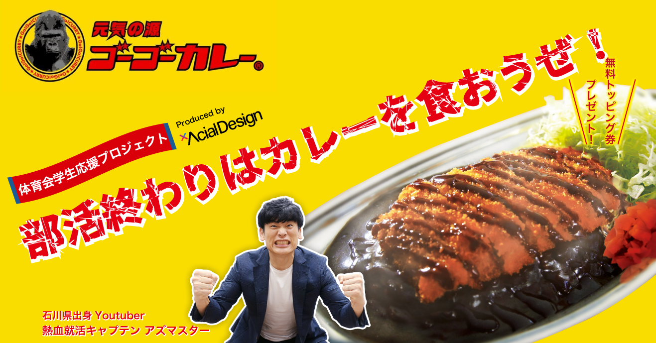体育会学生・アスリートの就職支援を行う株式会社アーシャルデザイン(所在地:東京都渋谷区、代表取締役社長:小園翔太)は、この度、ゴーゴーカレーグループ(本社:東京都千代田区、代表取締役:宮森 宏和、以下「ゴーゴーカレー」)とのコラボレーションを実施いたしました。トッピングサービスをプレゼントし、食べ盛りの体育会学生を支援します。