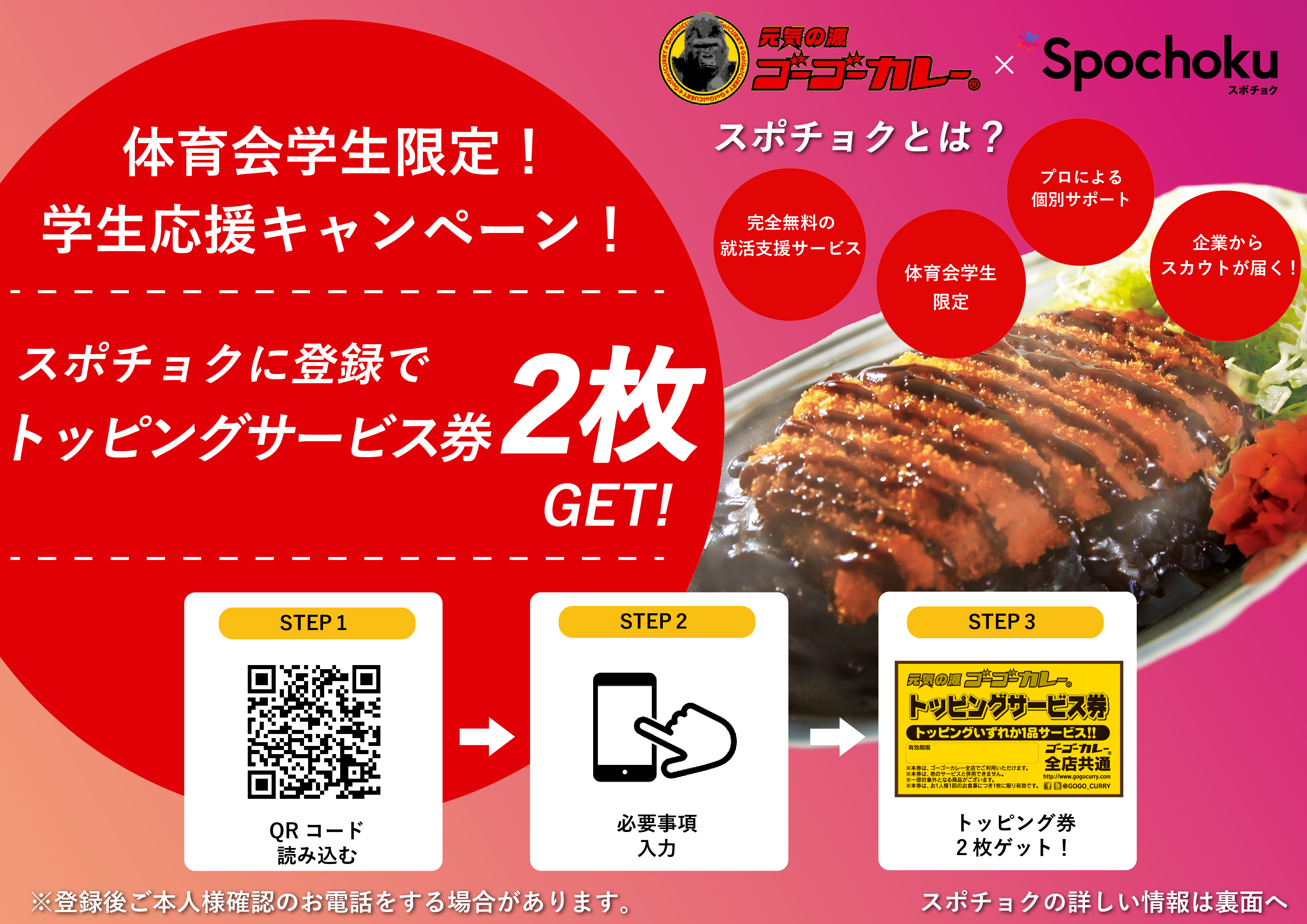 体育会学生限定のアルバイト・就職先を紹介する「スポチョク」に登録すると、トッピングサービス券2枚をプレゼントいたします。この券を使うと全てのトッピングの中から1つ無料でもらえます。