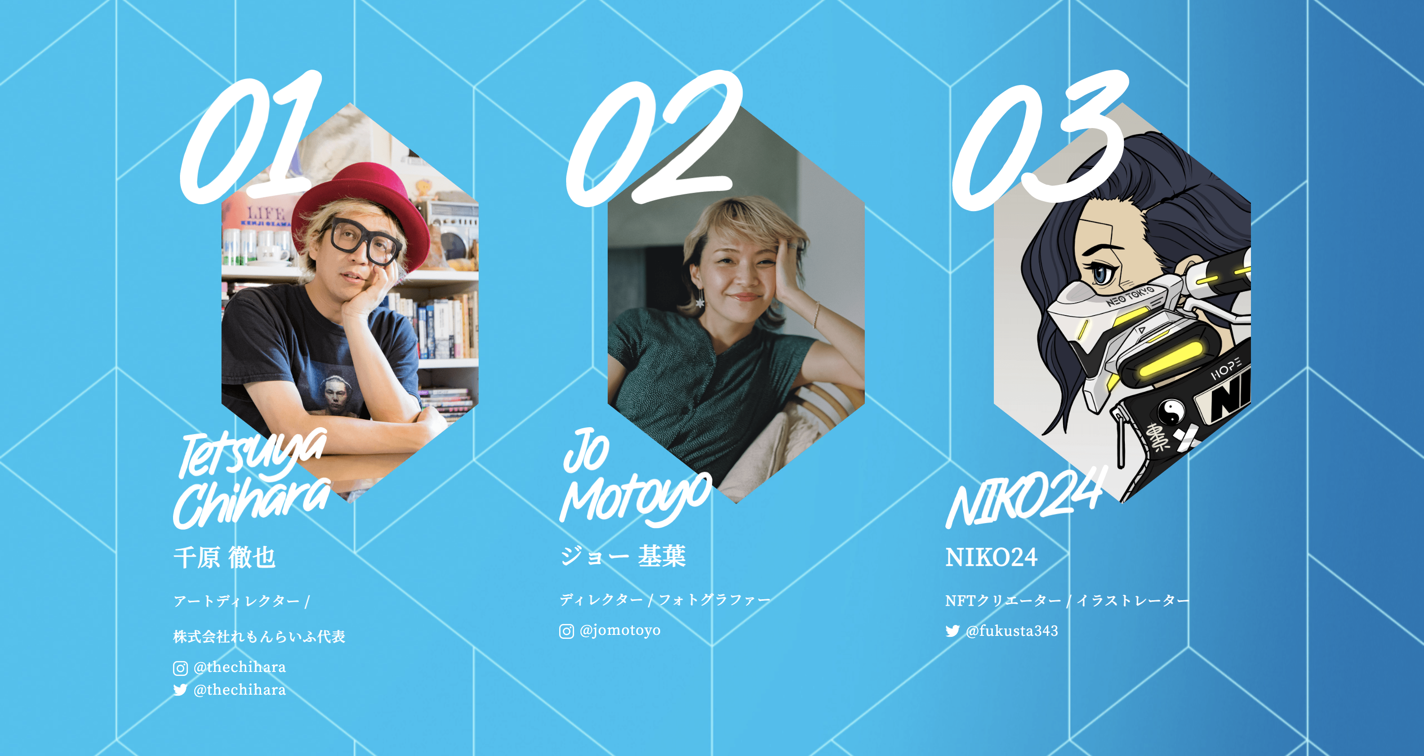 1985年福岡県生まれ。2021年9月にNFTクリエーターとして活動を始める。2022年3月にリリースした「サイバーパンク」をテーマにしたジェネラティブNFTコレクション『NEO TOKYO PUNKS』は2222枚のNFTが2分で完売。opensea(NFT取引所)24H取引高ランキングでは、当時国内初となる27位にランクイン。2022年10月現在の総取引高は3億円にのぼる。NFTという新しい技術から誕生したIPを世界に広めるために活動を行なっている。
