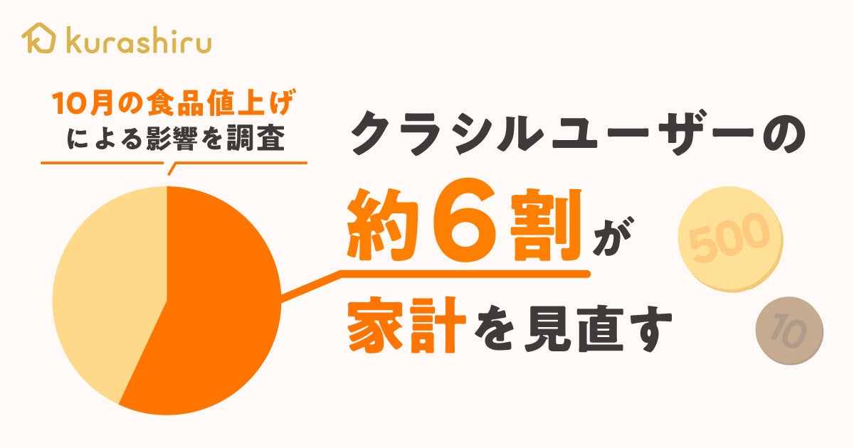 国内No.1のレシピプラットフォーム(※1)「クラシル」は、ユーザーを対象に「10月の食品値上げによる影響」を調査しました。(※2)その結果、回答者の約6割が値上げの影響で「家計を見直した」と回答しました。また、値上げが相次ぐも、理想の食費は現状から月5,000円の節約が必要な傾向が見られました。調査結果を受け「クラシル」は、食費を抑える工夫として、食材の使い切りや代用レシピを公開しました。