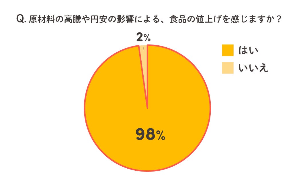 回答者の98%が報道だけでなく、実生活でも「食品の値上げを感じる」と回答しました。