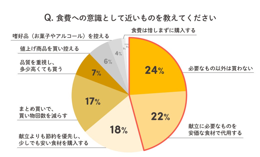 購入量は最低限にしつつも、回答者の22%が「献立に必要なものは安価な食材で代用」と回答しており、調理を工夫することで満足感は下げないようにしていることがうかがえます。