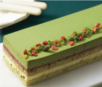 ・商品説明:ピスタチオのムースと生地の濃厚な味わいと香りを楽しめるよう、ピスタチオとアーモンドが入ったホワイトチョコレートムースを合わせました。