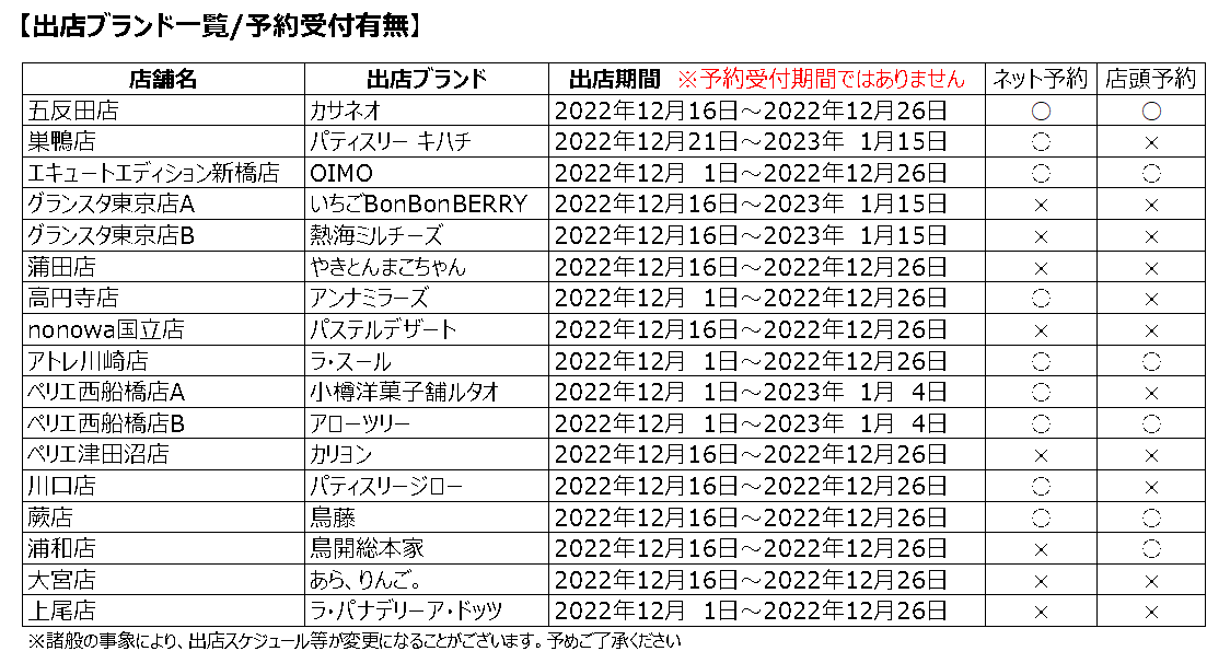 店舗によって異なりますので、各店の出店期間内にお問い合わせください。