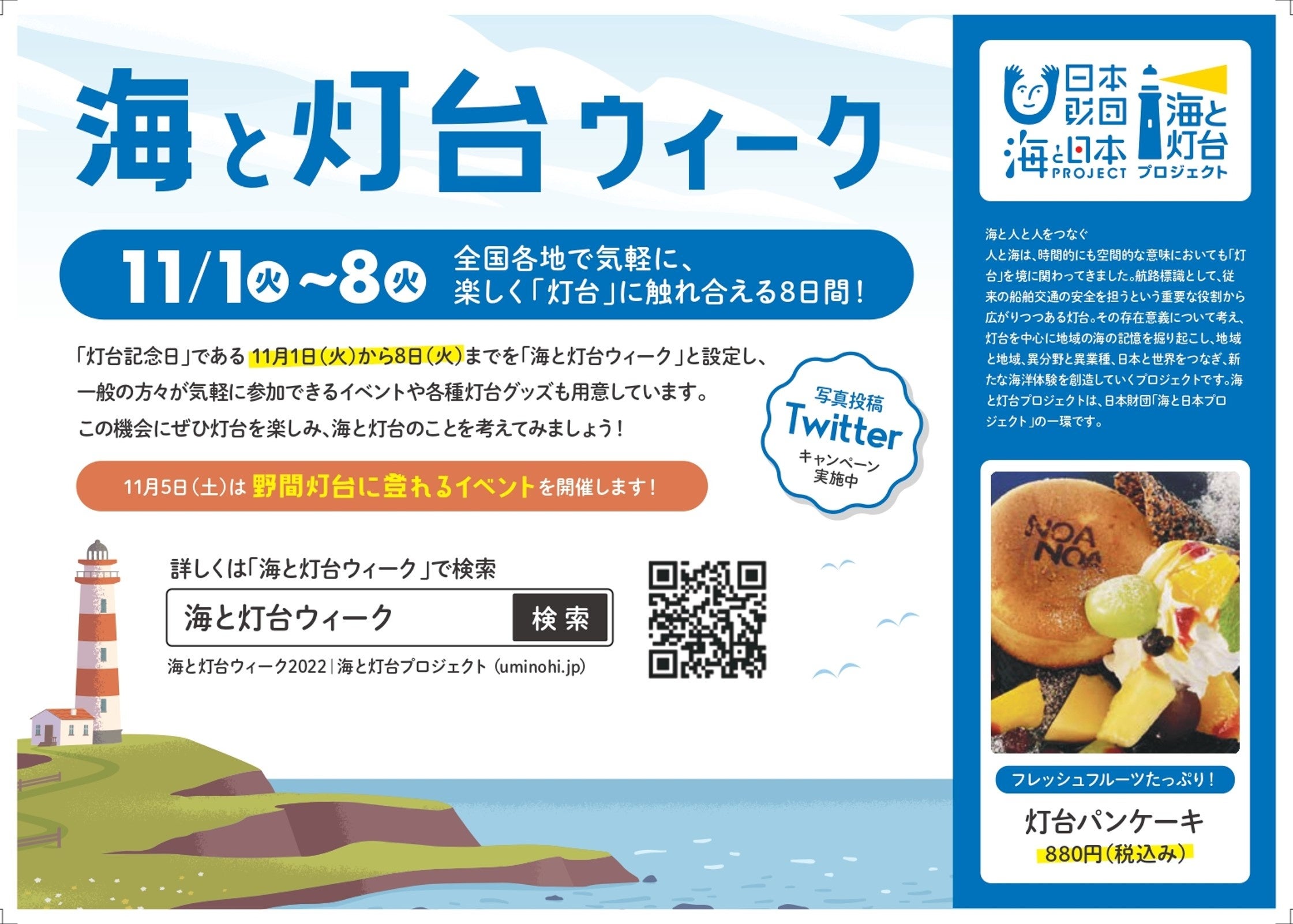 海と日本プロジェクトin愛知県実行委員会は、2022年11月3日(木)~11月6日(日)に「海と灯台ウィーク」と南の島のカフェレストラン TERRACE NOA NOAとのコラボレーションとして「灯台パンケーキ」を提供します。この取り組みは、次世代へ海を引き継ぐために、海を介して人と人とがつながる“日本財団「海と日本プロジェクト」”の一環です。