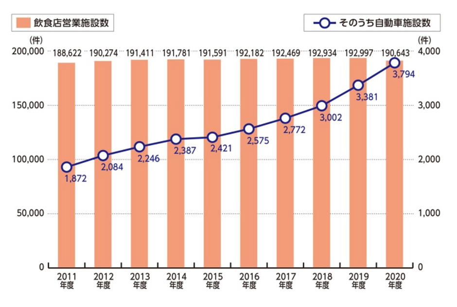 増加の背景には飲食店や物販などの新規販路開拓としてのニーズの高まりが一因として考えられます。東京都福祉保健局の「食品衛生関係事業報告」によると、東京都の「飲食店営業の自動車数」は2011年度の1,872件から2020年度の3,794件と約2倍、2019年、2020年のコロナ渦で伸び率がさらに高くなっています(図1)。