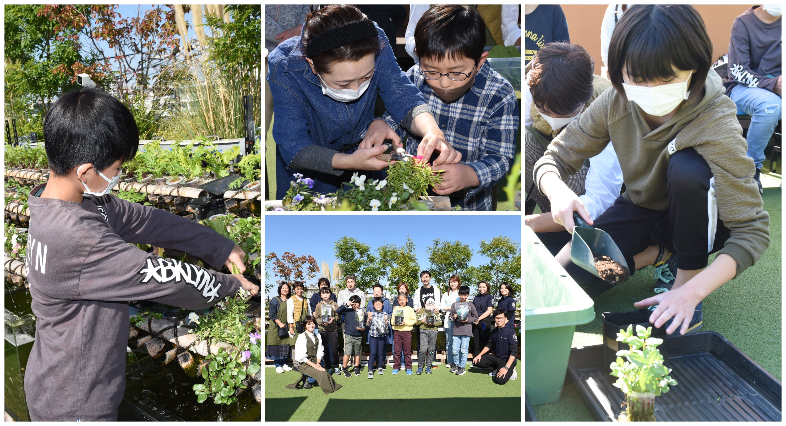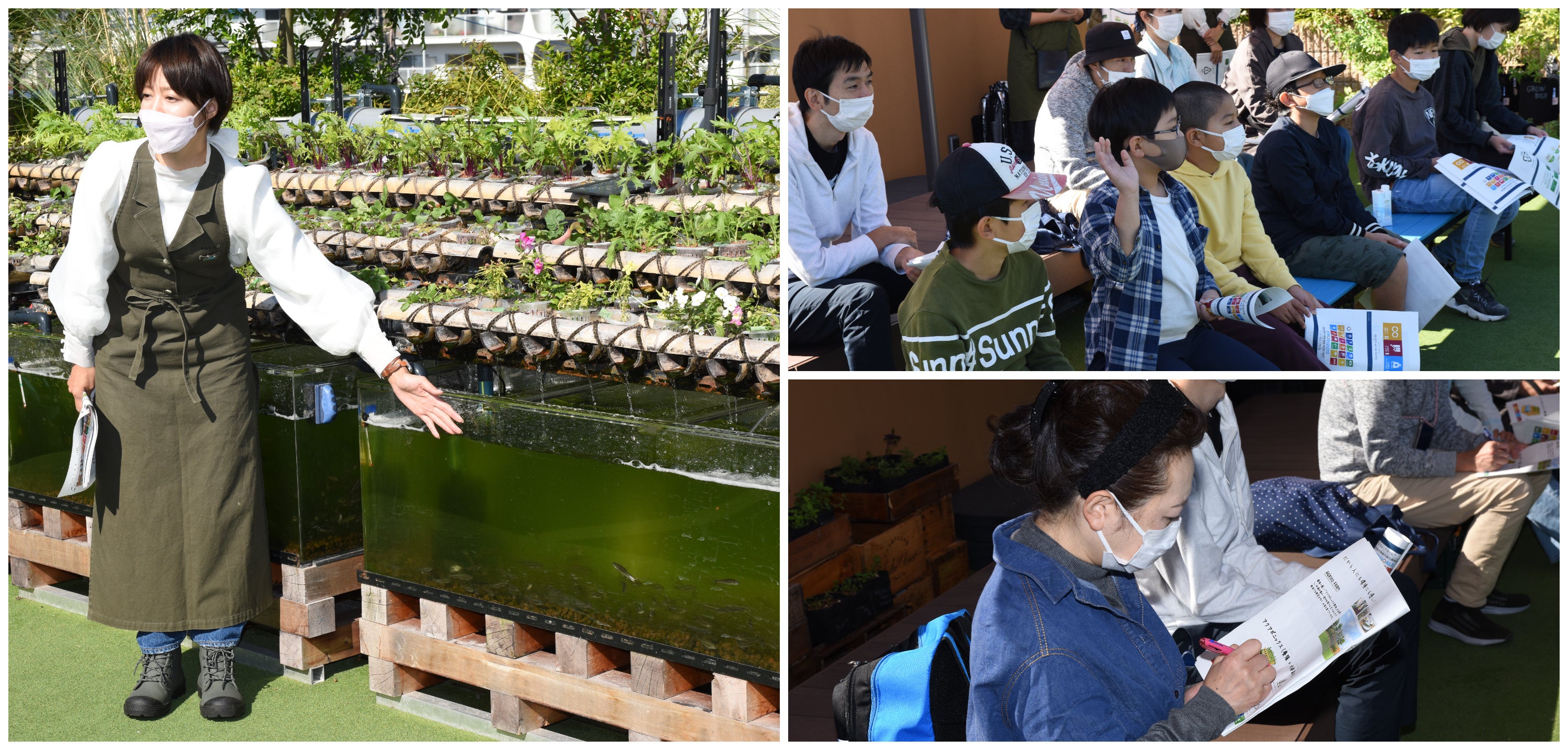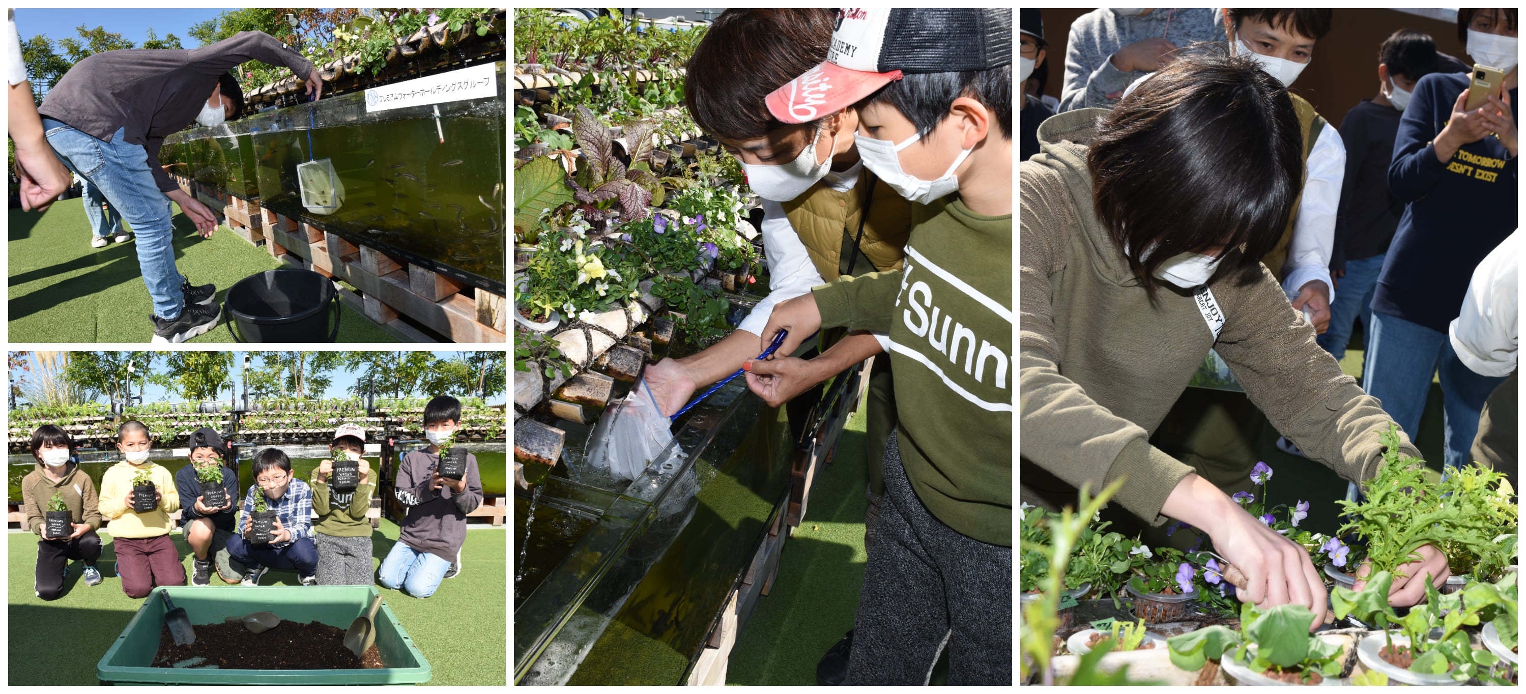アクアポニックスで養殖したホンモロコの収穫と、からし水菜やエディブルフラワーなどの野菜の収穫を体験。その他、プレミアムウォーターホールディングスグループの障がい者の社員が一つずつ丁寧に文字を書き入れたオリジナルのプランターに、ペパーミントなどのハーブを植える栽培体験も行いました。