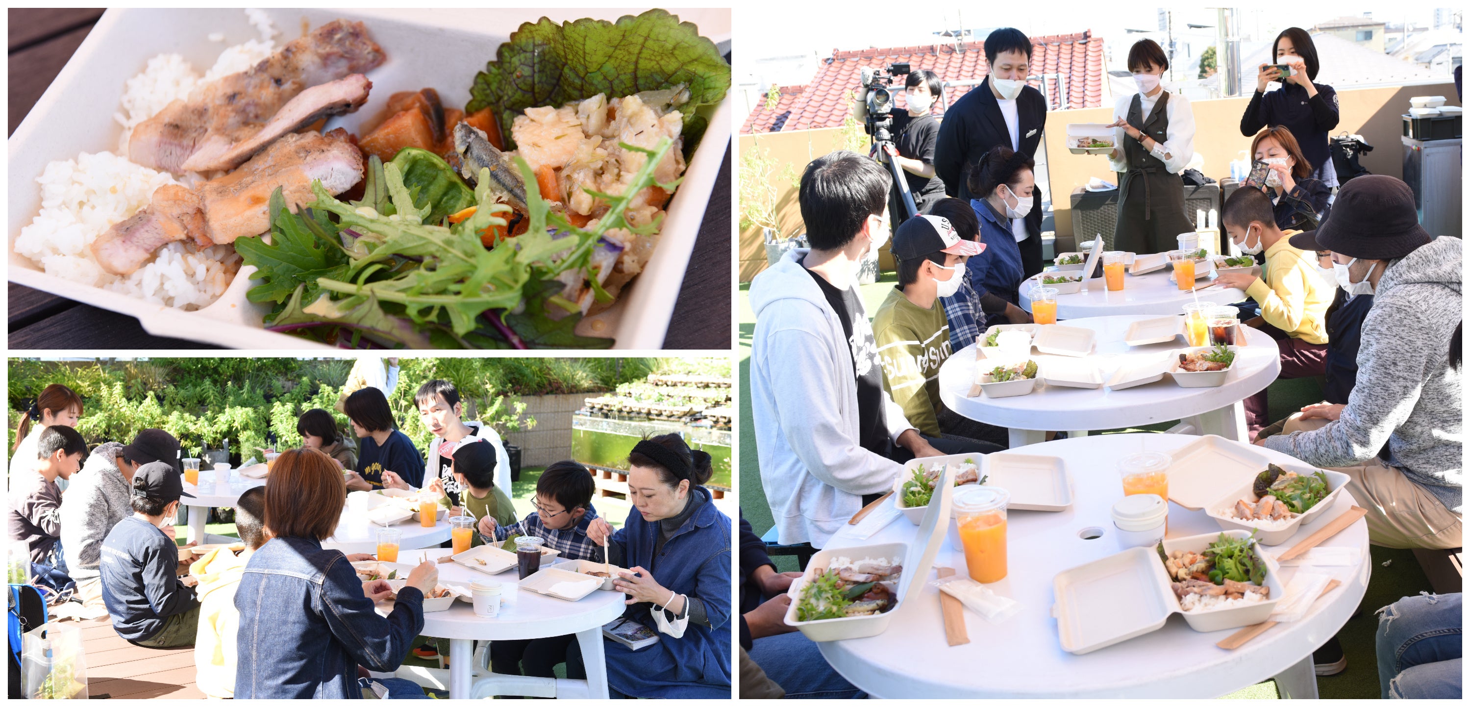 参加者の皆さんが収穫した魚や野菜は、収穫後すぐに一階のOGAWA COFFEE LABORATORY桜新町に持ち込まれ、特製のランチボックスの食材として使っていただきました。OGAWA COFFEE LABORATORY桜新町の松政店長より、ランチボックス内のメニューや調理方法などについてもお話いただきながら、参加者全員でおいしく味わいました。自分たちが収穫した魚や野菜を実際に食べることで、食育や食の循環についても学びました。