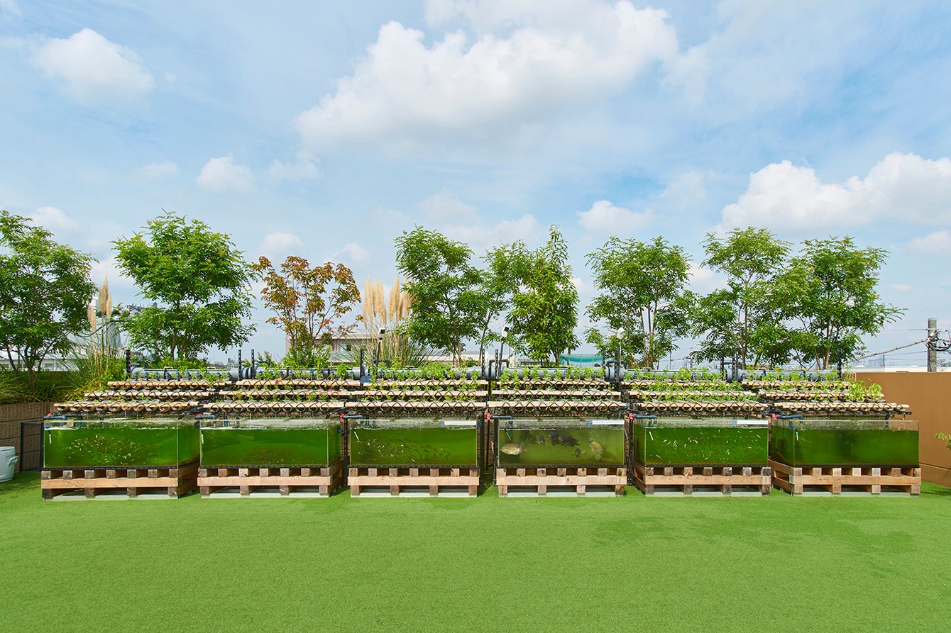 水耕栽培と水産養殖のシステムを合わせ持つ、環境にやさしい農業として世界でも注目されている「アクアポニックス栽培」を導入した循環型の屋上ファームです。