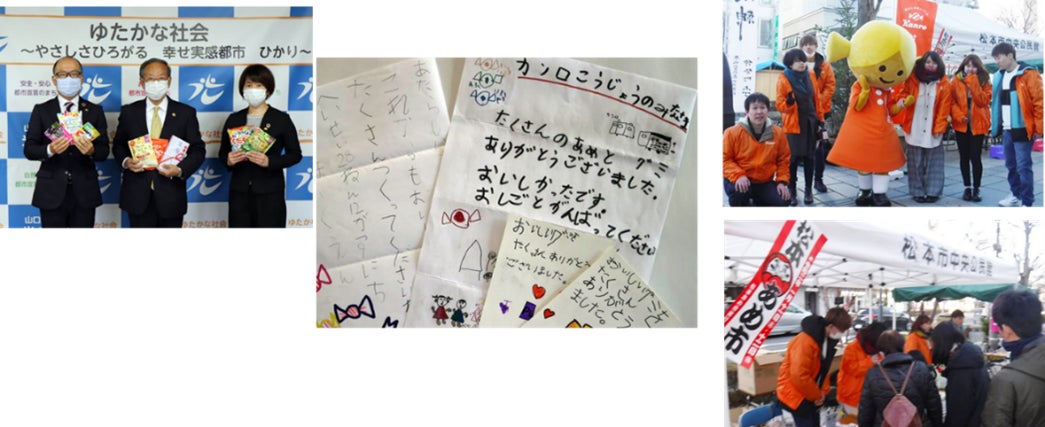 日頃カンロがお世話になっている地域の皆さまへは温もりのある交流を通じて感謝の気持ちを伝え絆を太くしてまいります。工場がある山口県光市、⾧野県松本市、⾧野県朝日村へ、創業日である11月10日前後に商品寄贈を実施します。また、地域の皆さまとの交流をより深めるべく、地元でのイベントを積極的に実施してまいります。
