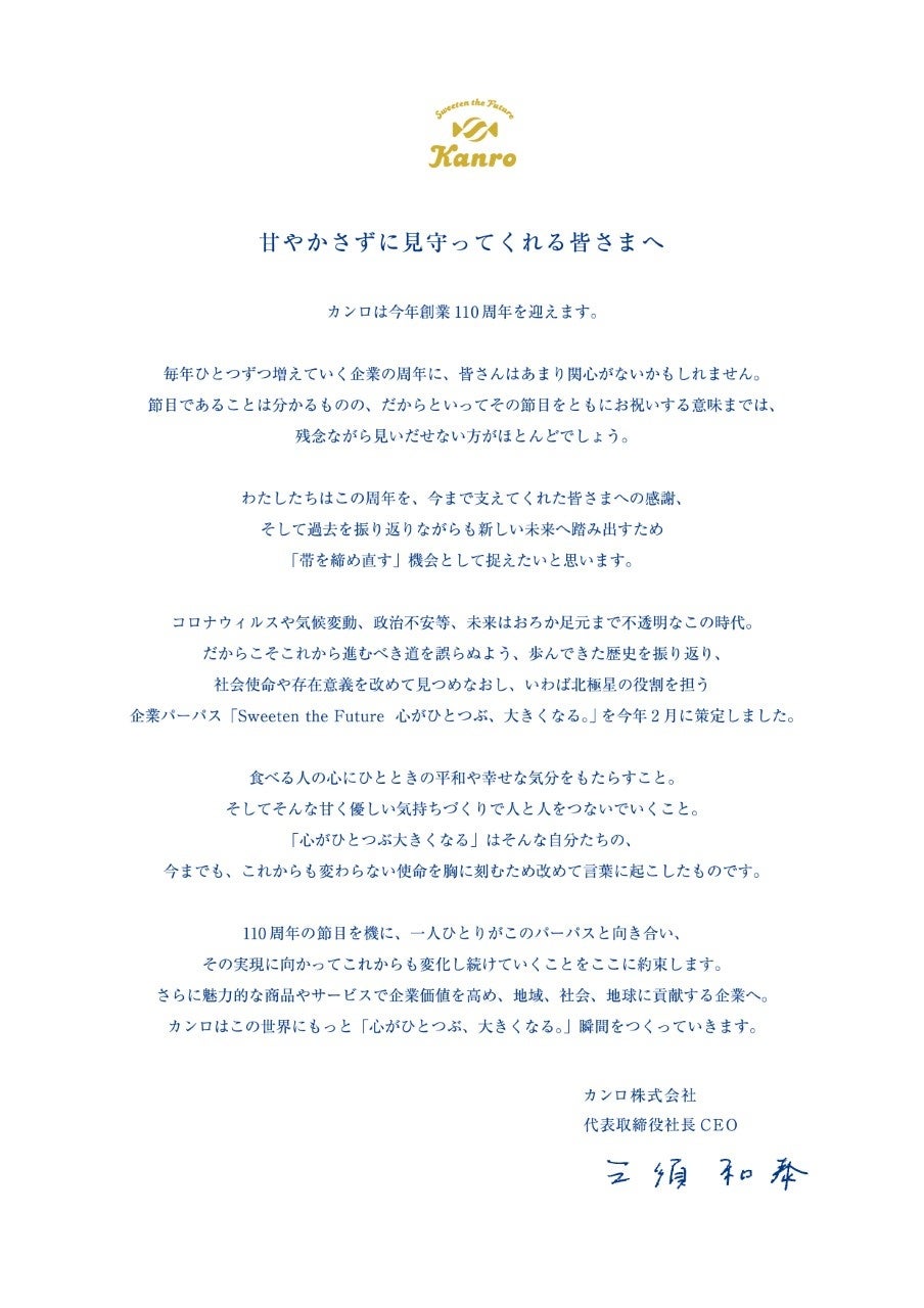 カンロ飴やピュレグミなどでおなじみのカンロ株式会社(本社:東京都新宿区、代表取締役社長 三須 和泰、以下 カンロ)は、大正元年の創業以来、2022年11月で創業110周年を迎えます。そこで110年を記念し、お客様をはじめとする、カンロを今まで支えてきてくれたすべてのステークホルダーの皆さまへ感謝の気持ちを込めた施策を展開します。