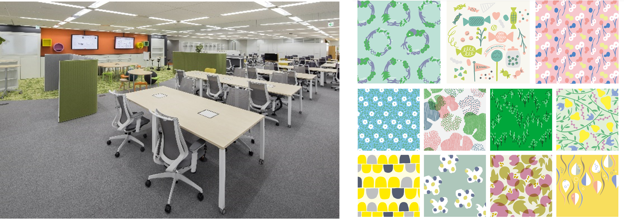カンロでは2020年2月よりテレワークの本格運用を開始していますが、コロナ禍を経た「オフィスの在り方」を再考し、社員の意見に耳を傾けながら、より良い職場環境づくりを目指します。それに伴い、執務スペースに110周年のグラフィックデザインを装飾し、機能性の追求に留まらない、気分がアガるオフィス空間を作り上げます。