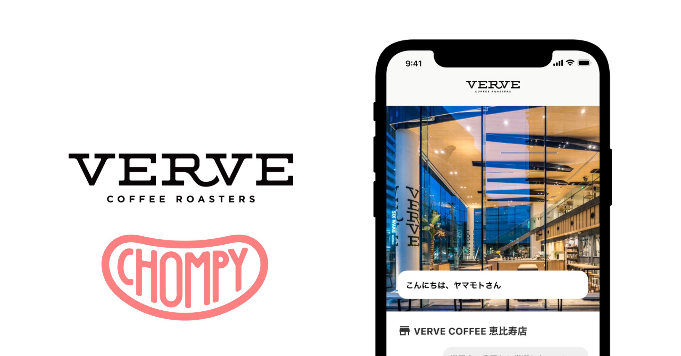 All in One モバイルオーダーサービス「Chompy(チョンピー)」を提供する株式会社Chompy(本社:東京都目黒区、代表取締役:大見周平)は、株式会社ヴァーヴ・コーヒー・ロースターズ・ジャパン(本社:東京都渋谷区)が、2022年11月8日に旧三越恵比寿店跡に「VERVE COFFEE ROASTERS 恵比寿店(ヴァ―ヴ・コーヒー・ロースターズ。以下、VERVE COFFEE ROASTERS)」がオープンするのを機に、全5店舗(新宿店、六本木店、鎌倉雪ノ下店、北鎌倉店)で当社のアプリが初導入されることをお知らせいたします。オープン前日11月7日には、報道関係者を対象とした内覧会を開催予定ですので、ぜひご参加いただきますようお願い申し上げます。
