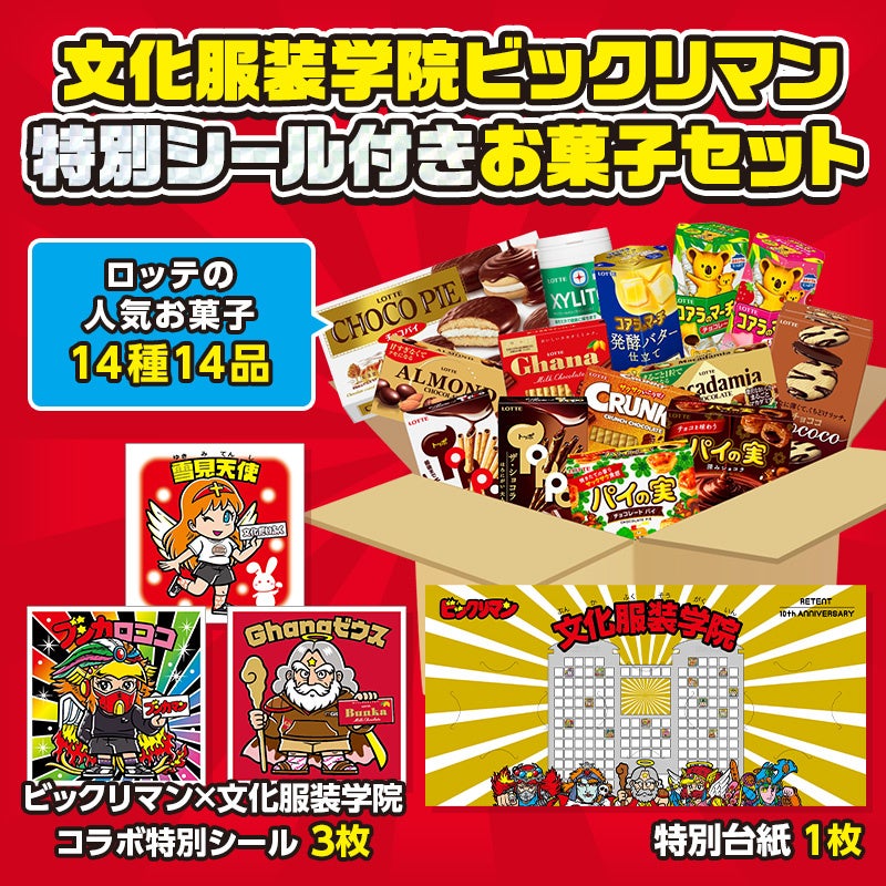 株式会社ロッテは11月4日(金)正午より、ビックリマンチョコシリーズから「文化服装学院ビックリマン特別シール付きお菓子セット」をロッテオンラインショップ限定で発売いたします。封入内容はお菓子詰め合わせ(14種14品)、ロッテオンラインショップ限定の『特別シール』が付いたセットです!3,000セット限定となっております。ぜひお買い求めください。