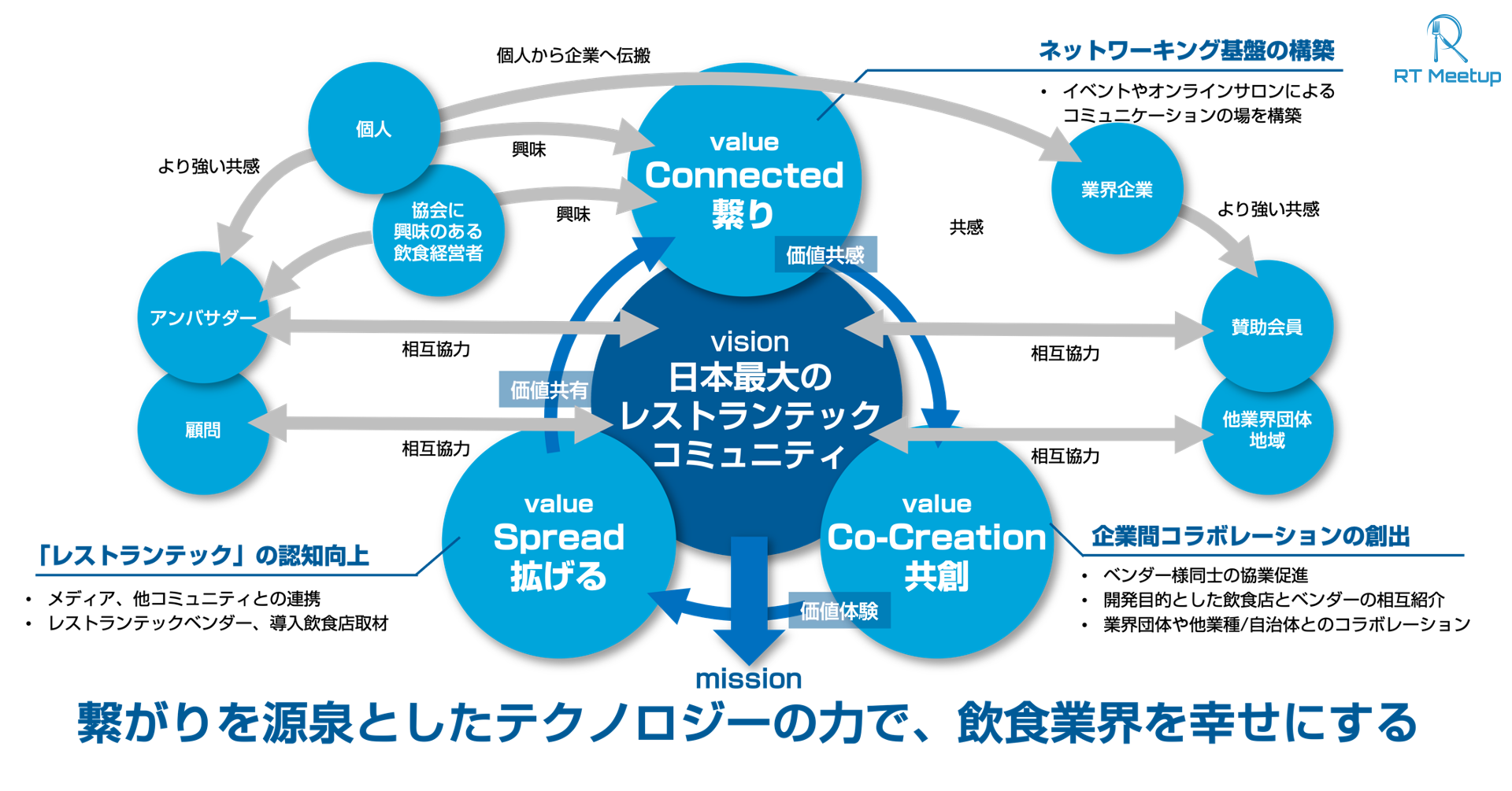 「テクノロジーの創出は、人の繋がりが源泉である」と私達は考え、「人」を繋ぐことで生み出されたオープンイノベーションが「価値あるアイディア」となり、飲食業界の持続的な発展に繋がると確信しています。