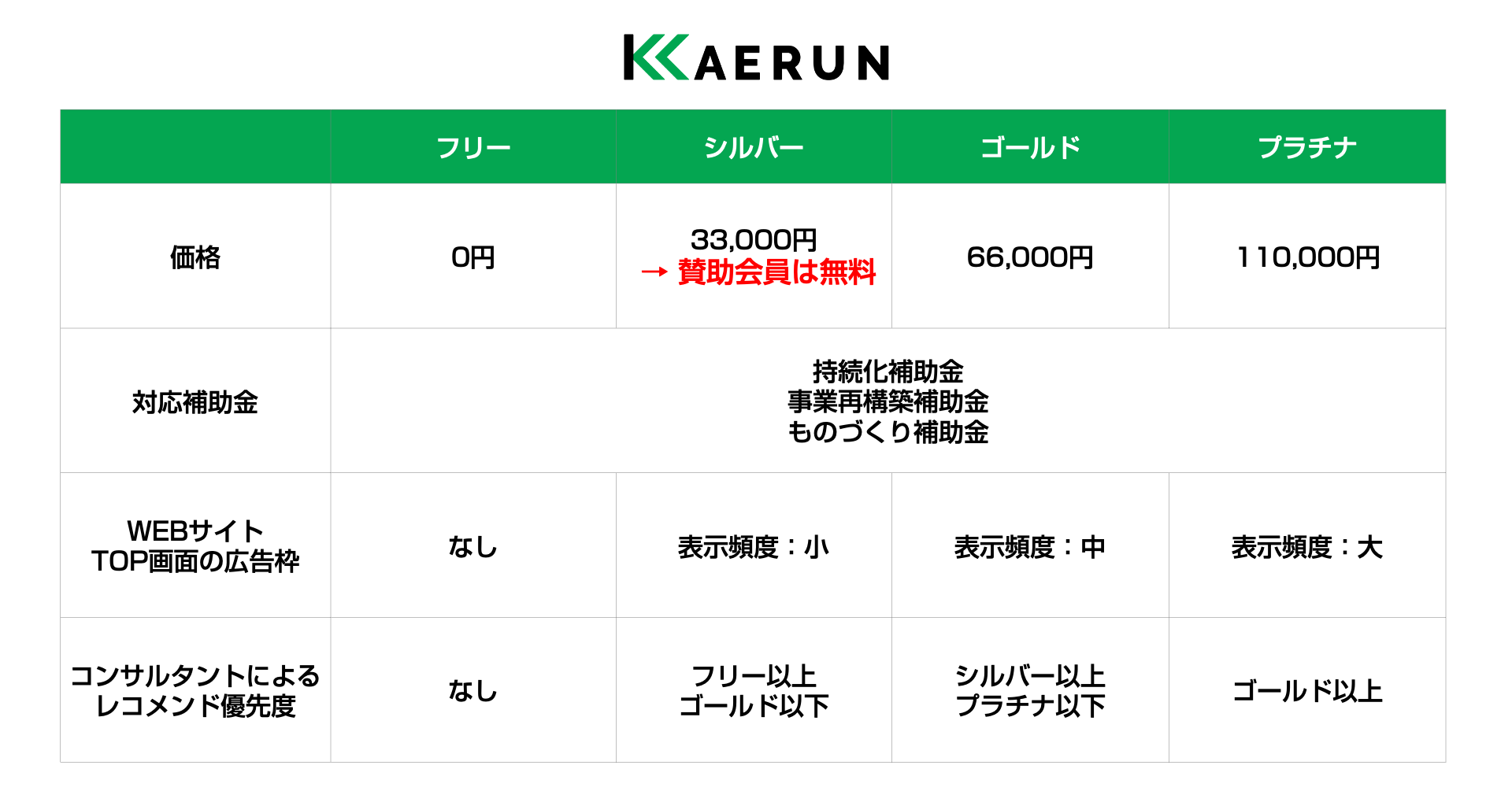 今回の業務提携は、飲食店がITツールやロボットなどの導入の金銭面的なハードルを下げることでDXの促進する為に、サービスと各種適用できる補助金をマッチングするプラットフォーム「KAERUN」のシルバープラン(税込33,000円 / 月額)を賛助会員に無償提供します。