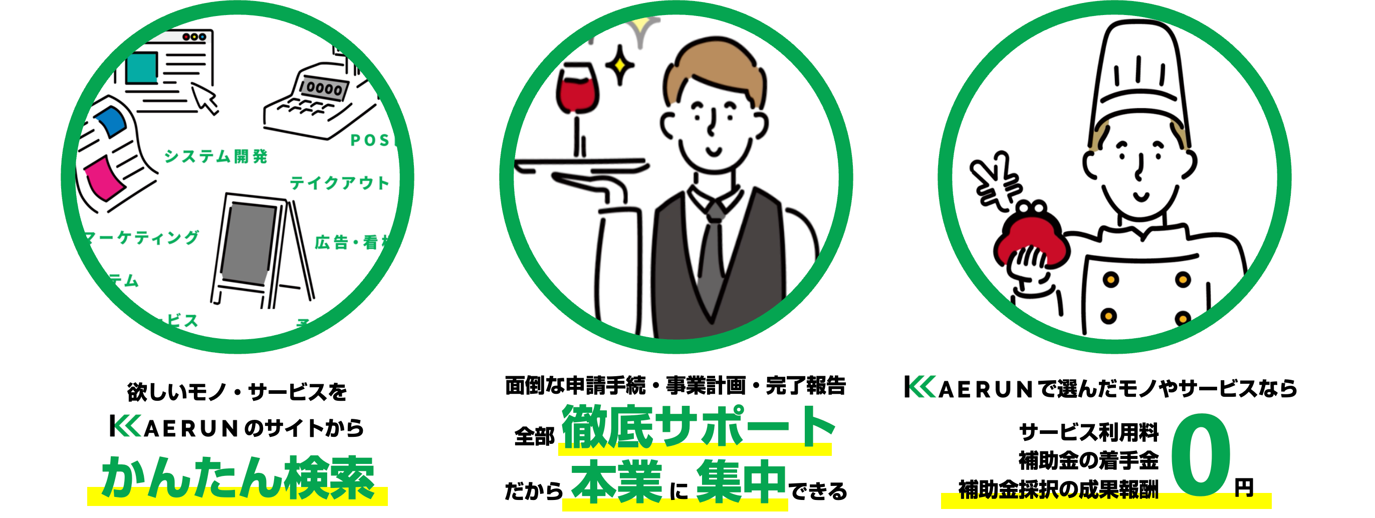 「KAERUN」とは、飲食企業・飲食店向けベンダー・KAERUNサポーター(補助金申請サポート企業)の3者を繋ぐ補助⾦プラットフォームです。