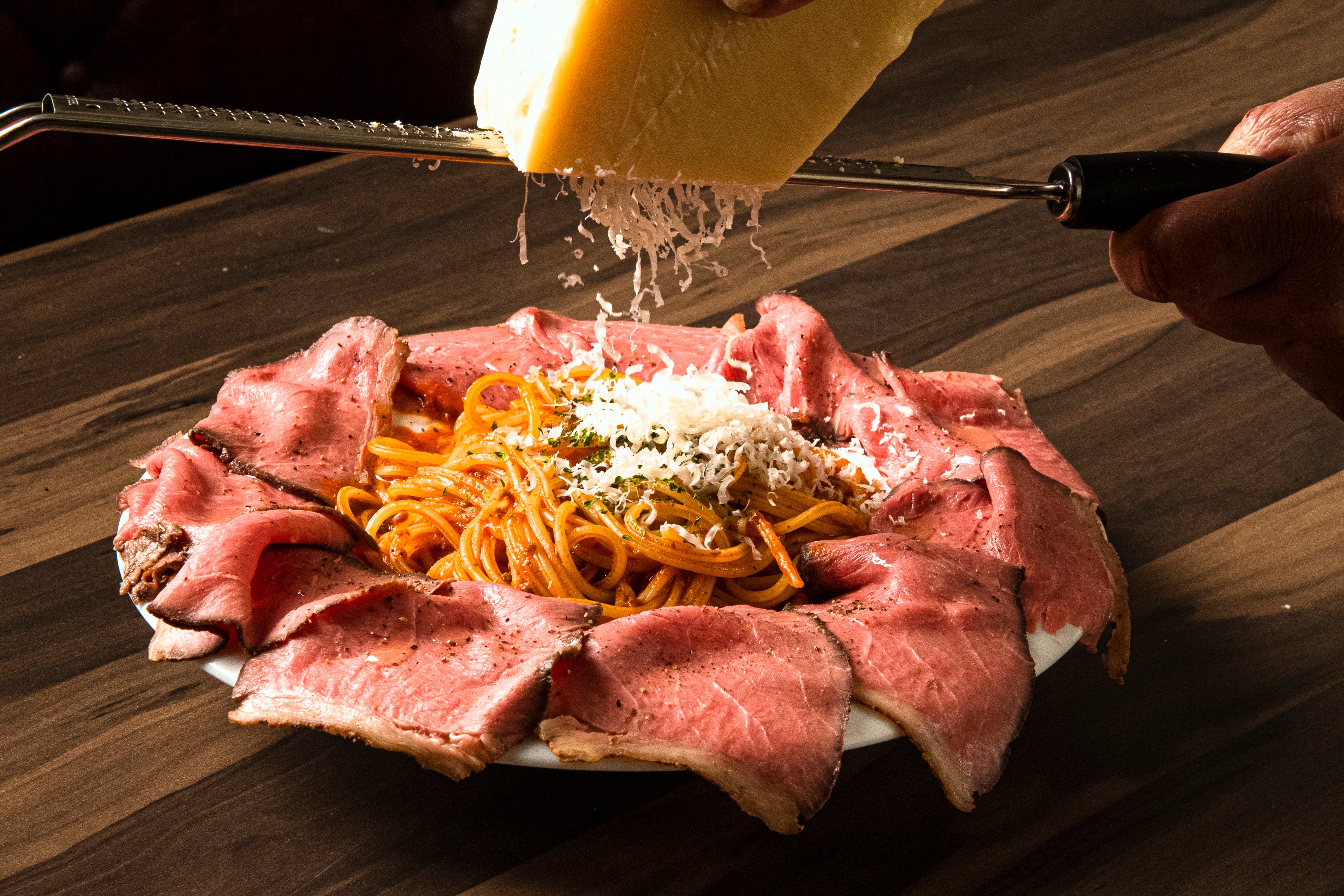 ローストビーフをふんだんに使用し、豪快に食べるボロネーゼ