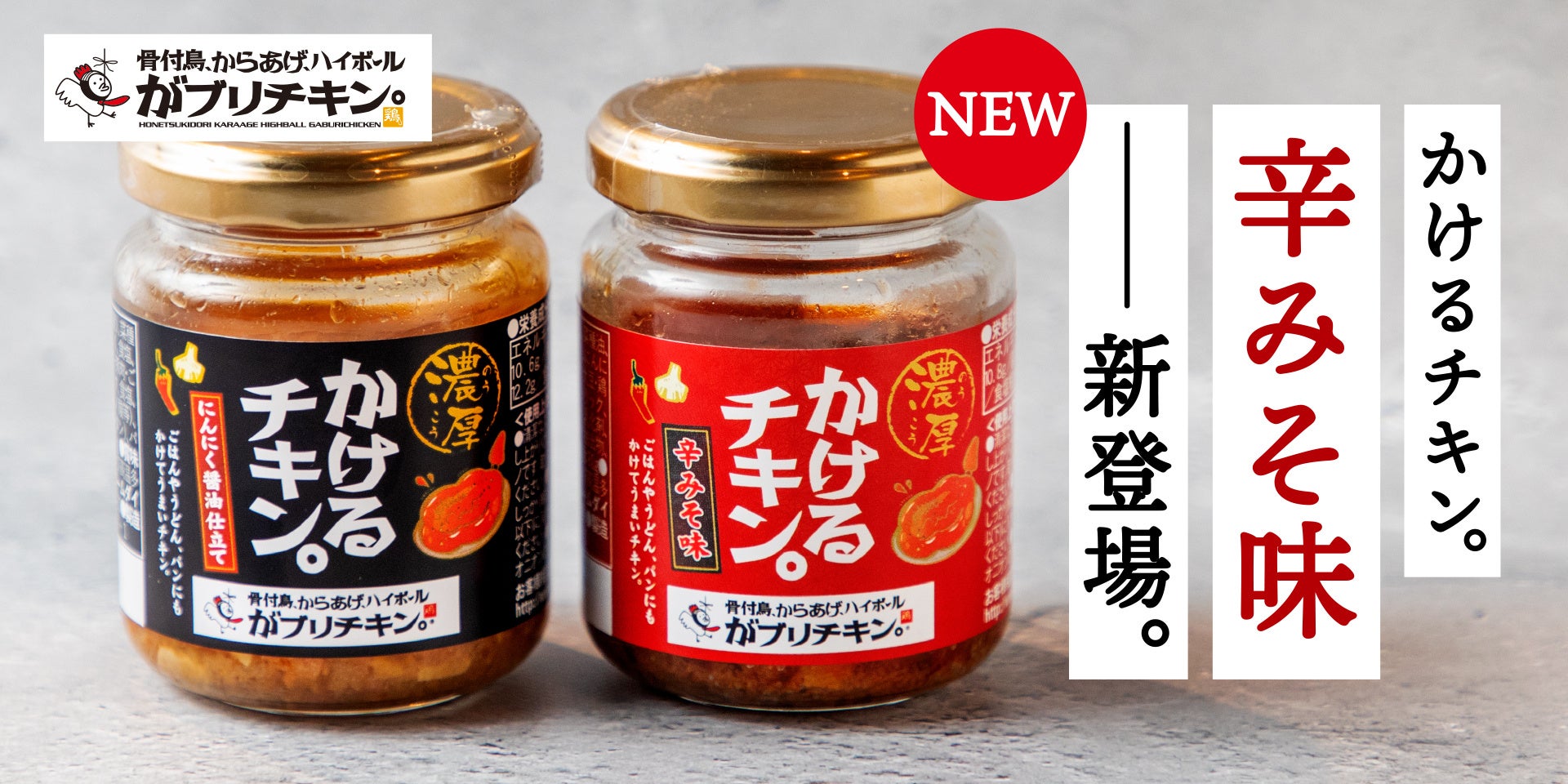 昨年8月に販売を開始してから反響が大きく、今年の9月には更に旨味を凝縮して美味しさを求めた「新・かけるチキン。」を販売し、「味が濃厚になって美味しい」「小瓶サイズになって食べやすくなった」といったお声を多くいただいております。今回リクエストの多かった「辛みそ」テイストの商品が仲間入りします。お家でのお料理のアレンジや、キャンプといったアウトドアのシーンにもぴったり!名物「骨付鳥おや」を瓶詰めにした、まるでお店で焼いたかのような弾力、風味をお楽しみ下さい。